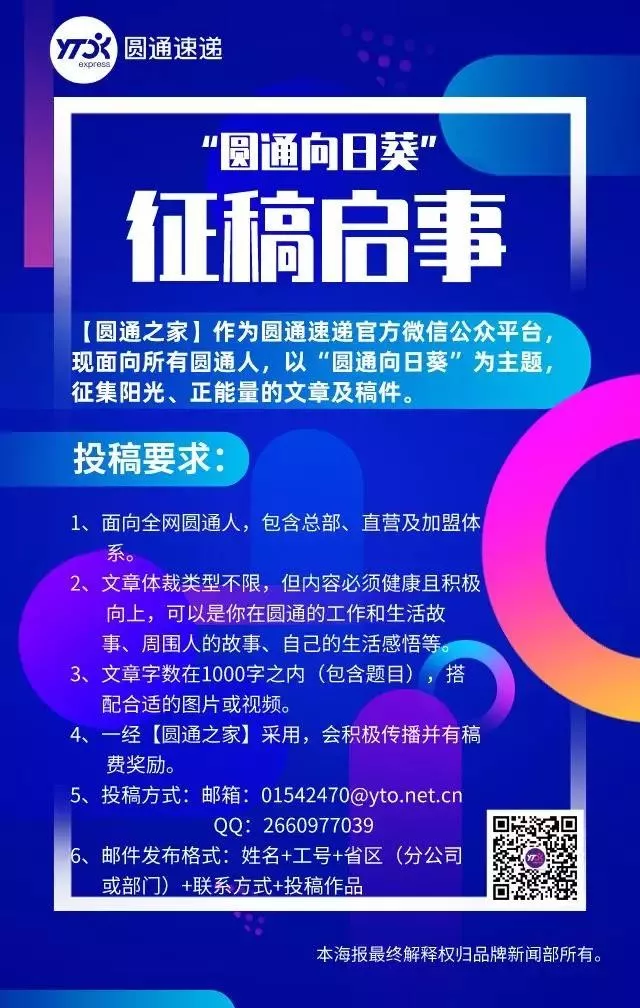 受此启发,《圆通之家》开设了《向日葵》栏目,面向全网圆通人征稿,欢迎分享在圆通工作、生活中的经历和感悟,长短与形式不限,要求表达真情实意、传播正能量。
