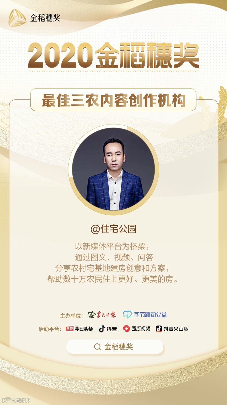 11月4日,2020金稻穗奖获奖名单名单。“住宅公园”获得了最佳三农内容创作机构奖。