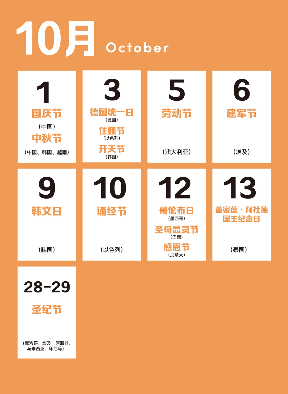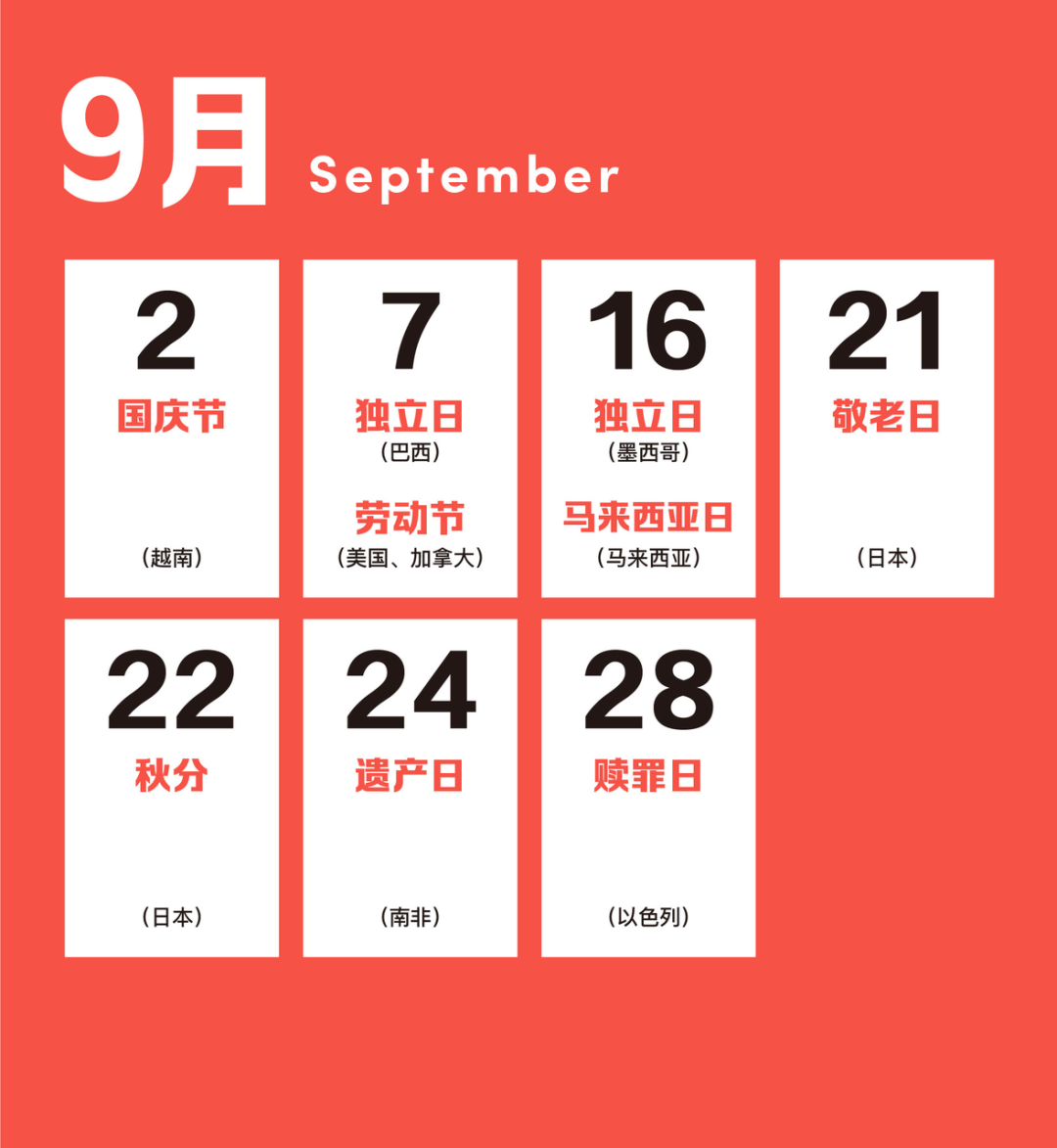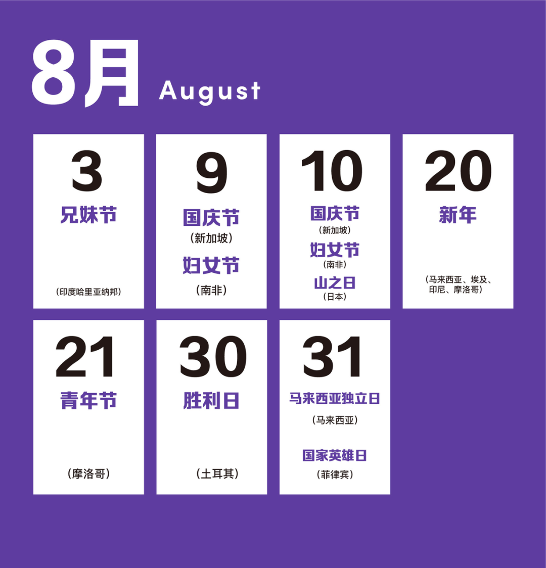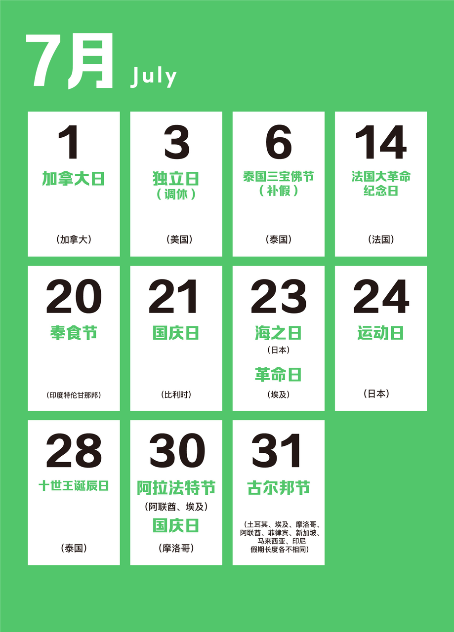 独立日/国庆日通常都是各个国家最重要的政治性假日。美国(7月4日)、法国(7月14日)、新加坡(8月9日)、印度(8月15日)、马来西亚(8月31日)的独立日/国庆节都集中在7月和8月间。在这个主题的节假日里,中国毫无疑问是假期最长的。