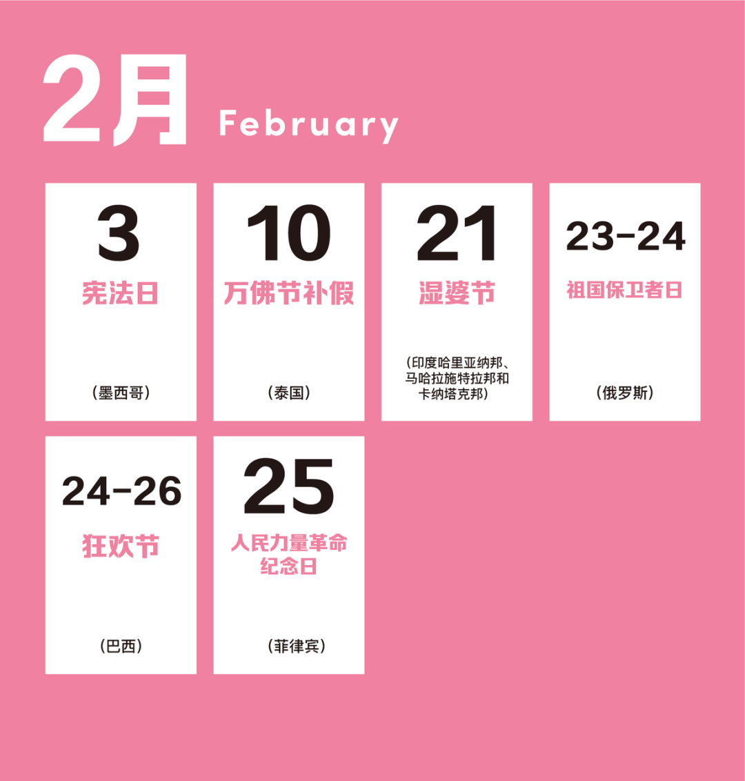 泰国的日历中有很多Substitution for XX Day,这里Substitution的意思是补假,泰国没有调休,如果节假日遇上周末,就会把工作日挪出来放假补上节假日。是不是很羡慕?