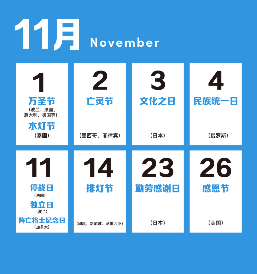 11月14日印度排灯节(Diwali),又称为万灯节、光明节、屠妖节,是印度最重大的节日。这一天,人们会在室内外摆放大量油灯、拼出神圣的图案,象征驱走黑暗和战胜邪恶。在新加坡、马来西亚,这一天(Deepavali)也是法定假日。