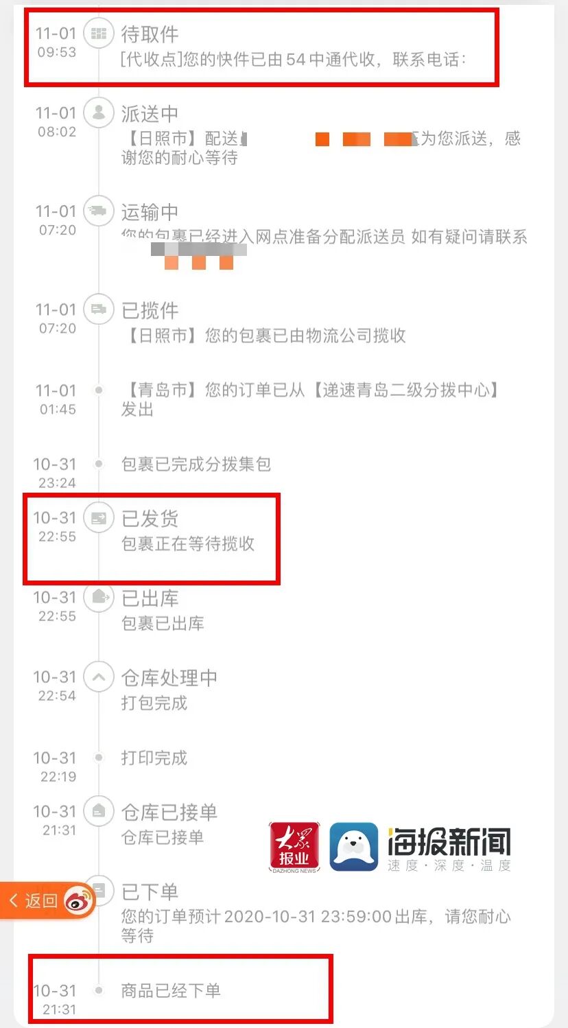 网友“开发区吴亦凡”11月1日0点31分付的款,中午10点47分,快递就已送达,这感觉倍儿爽。他说,“双十一”买东西这是到货最快的一次,感觉眼睛一闭一睁,快递就到了。