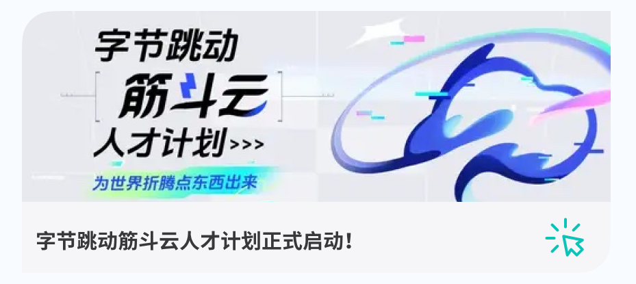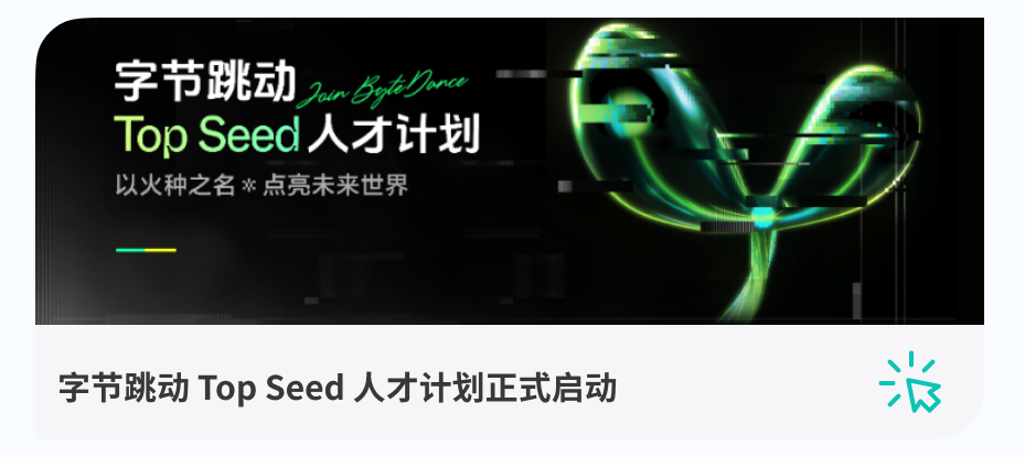 最后还有一些想说的心里话,就藏在这首歌里啦👆。欢迎投递字节跳动校招岗位,博士学弟学妹们可以重点关注 Top seed 和筋斗云人才培养计划,点击文末阅读原文一键投递,期待在字节跳动和你们一起始终创业。
