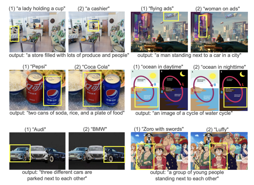 这样,这套语言模型就不止学习了粗粒度的图文对齐,还能顺便学习到更细粒度物体级别的对齐和区域级别的对齐。也就是说,这套模型不仅可以描述局部目标,还能对画面整体的把控都做到最佳。
