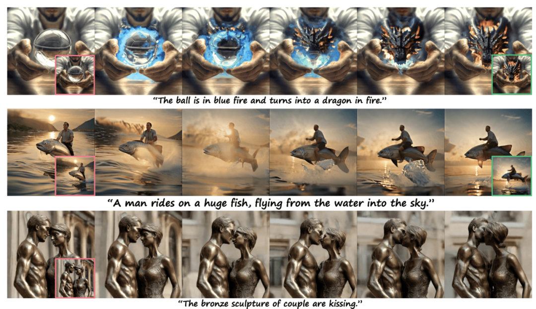 在这个模型里,给定文本的生成结果,第一帧指令用红色框突出显示,最后一帧指令用绿色框突出显示,画面中间的几帧就将合理的动起来。