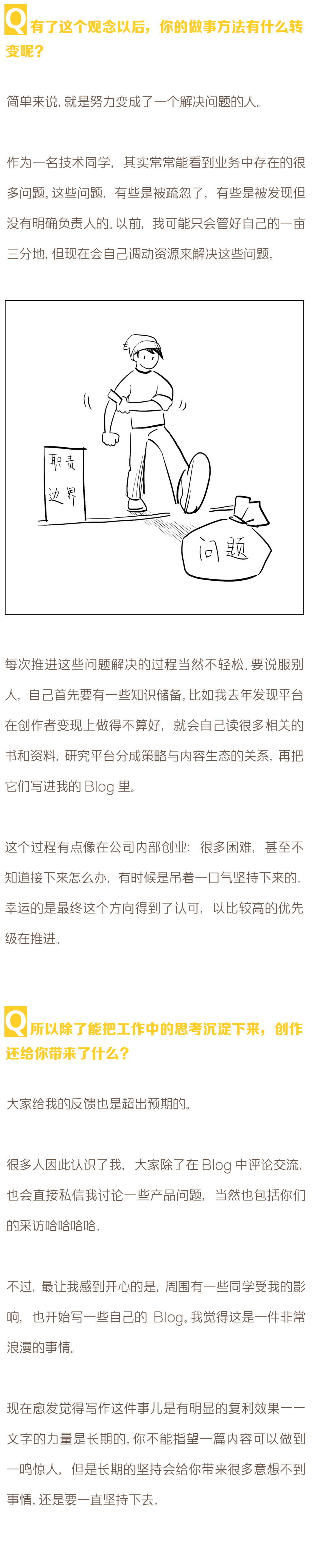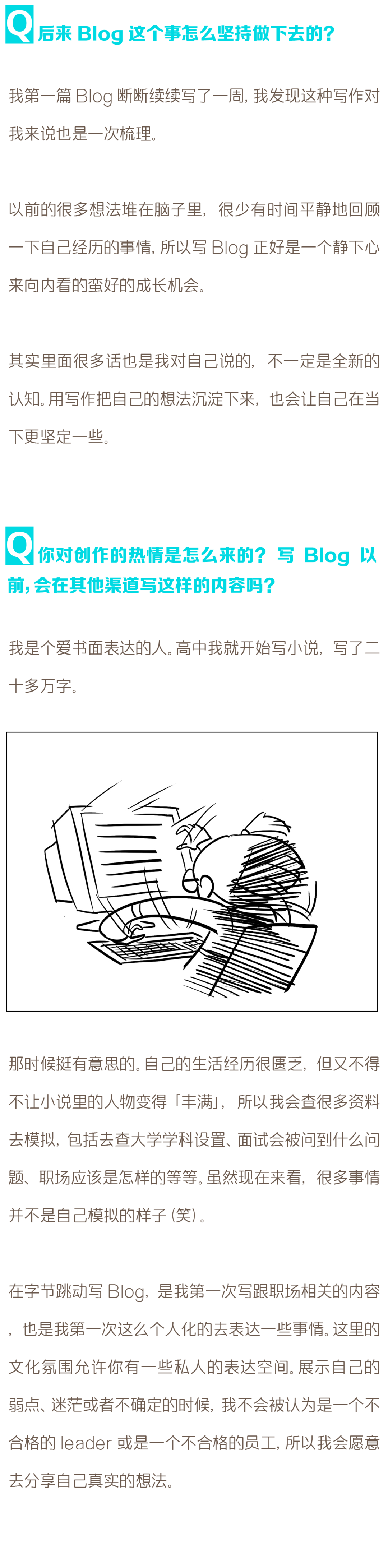 而在Blogger这个身份背后,大家的职业形形色色——有业务负责人分享自己的管理思考,有程序员记录产品洞察,也有设计师通过漫画记录自己成功瘦身40斤的神奇经历。