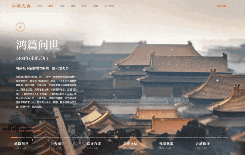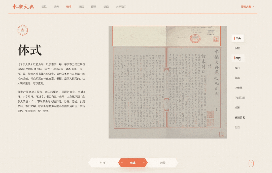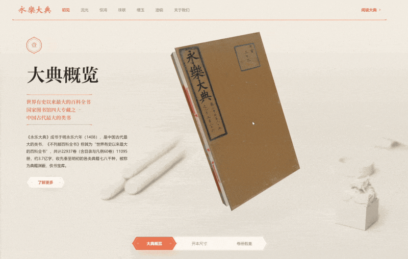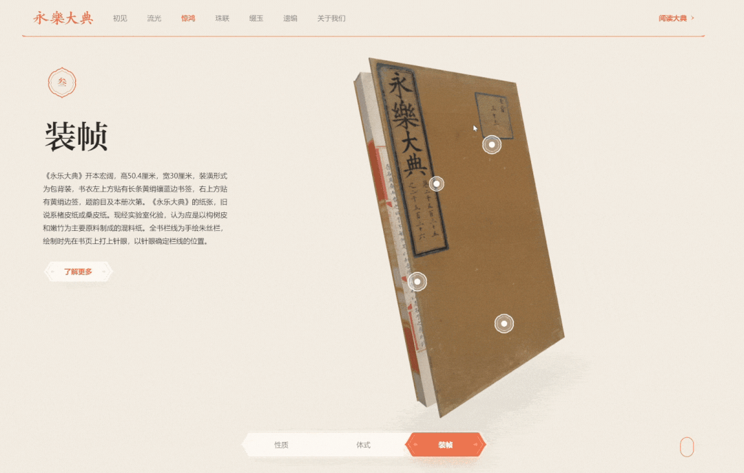 里面不仅有《永乐大典》的3D还原,用鼠标就可以拖拽、放大、翻页,还有对《永乐大典》纸张、装帧的详细介绍,所经历的历史变迁……