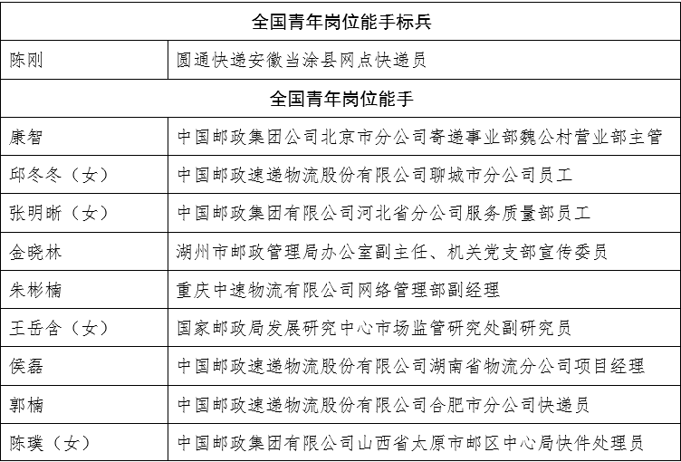 近日,共青团中央、人力资源社会保障部联合印发《关于命名表彰第20届全国青年岗位能手的决定》。在邮政快递行业,圆通安徽当涂县网点快递员陈刚获得“全国青年岗位能手标兵” 称号。