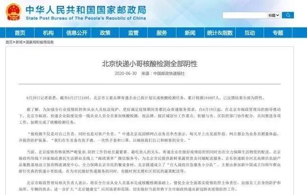 据国家邮政局官网发布的消息,截至6月27日24时,北京市主要品牌寄递企业已按计划完成核酸检测任务,累计检测104807人,已反馈结果全部为阴性。