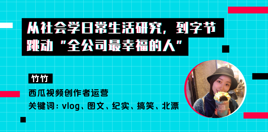就读于中国最好的社会学系之一,竹竹上学期间实习过传统媒体、科普自媒体、互联网,参加过田野项目、脱口秀训练营,因为觉得西瓜视频上有很多“充满生命力”的作者,竹竹对字节跳动充满好感,并最终入职西瓜做创作者运营。