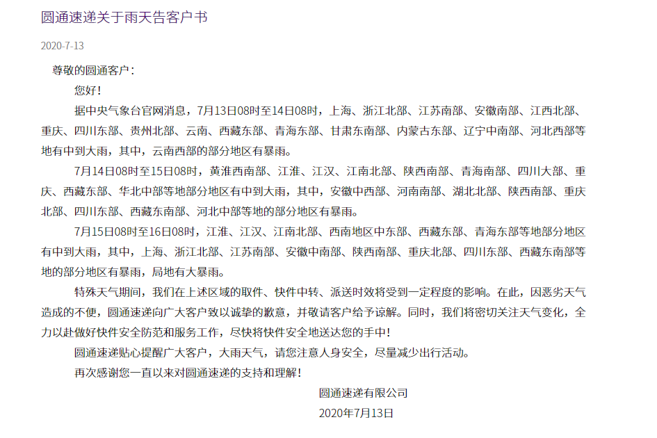 圆通迅速响应,全力以赴做好快件安全防范和服务工作,并及时发布关于异常天气情况的告客户书,在保障小哥自身安全的情况下,将快件安全地送达客户手中。