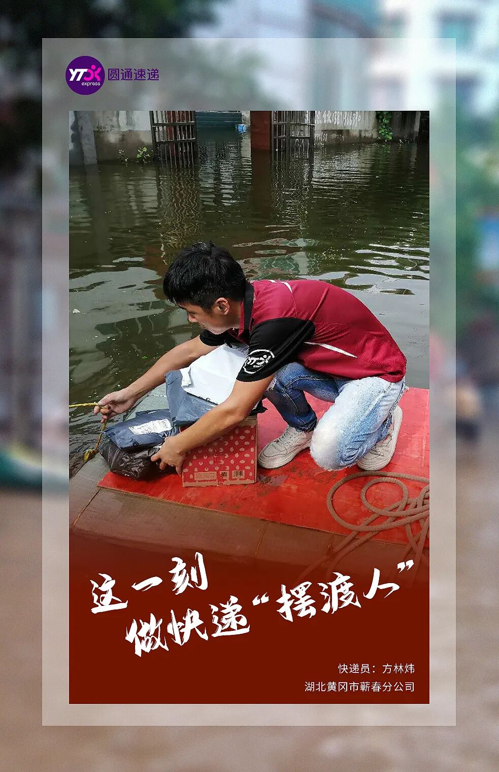 在湖北,近期,许多地区的道路被洪水淹没受阻,面对严峻的汛情,圆通湖北的快递员一方面投入抗洪抢险中,另一方面也在尽力派送快件,即时交付。