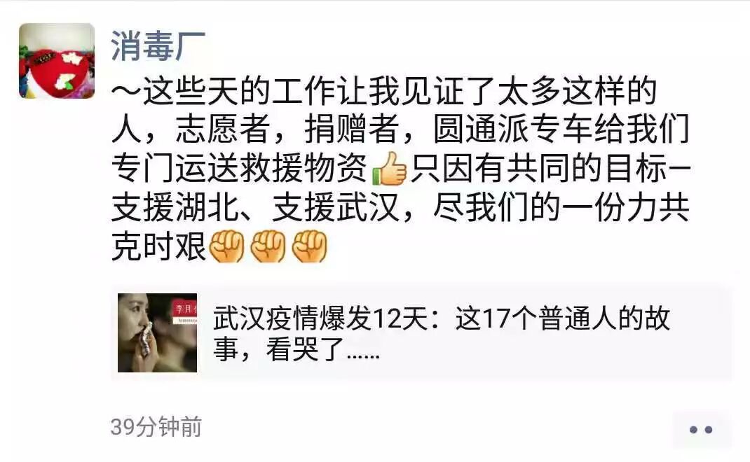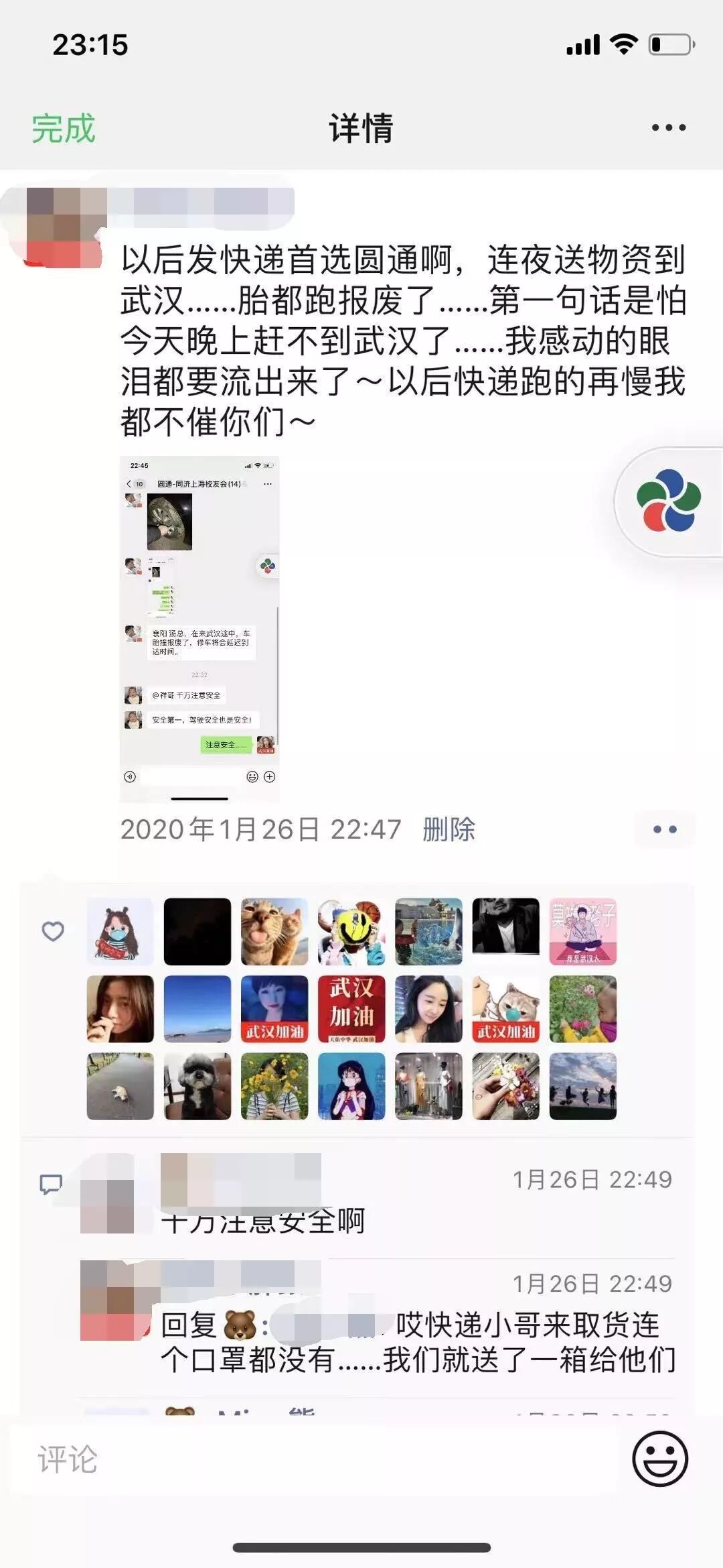1月26日,为了尽快将3万只口罩运往武汉亚心总医院,圆通司机路上车胎磨损报废,在微信群里说的一第一句话却是,“怕今晚赶不到武汉了。” 圆通人“不顾自身安危,只为早点送到”的敬业精神,委托人说她真的非常感动。