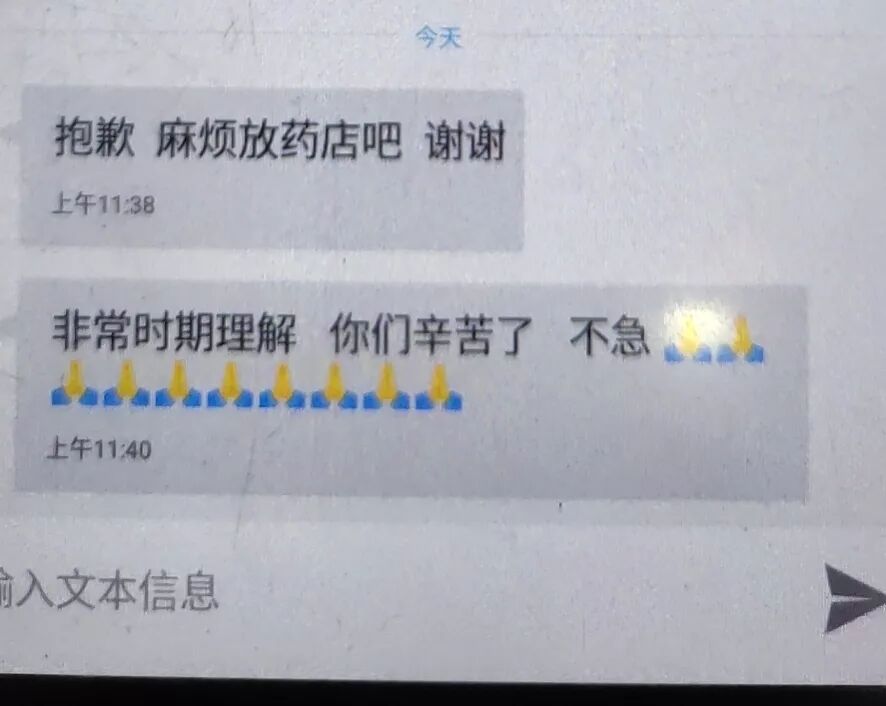 在这个“特殊”的春节期间坚持派件的业务员和小哥,受到客户的理解和感谢。圆通哈尔滨新世界分公司的小哥为客户送件,客户发来短信要求放置楼下即可,并夸小哥“非常时期理解,你们辛苦了!不急。”