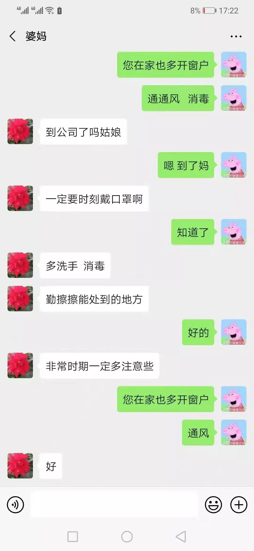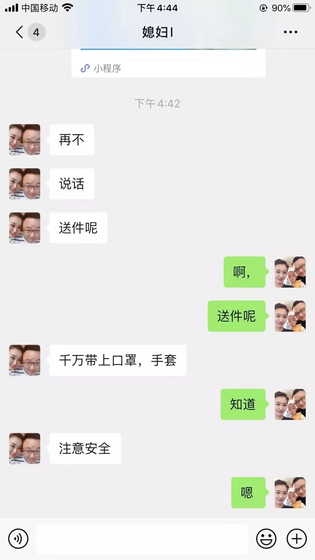 圆通吉林省白城市镇赉分公司客服任梦的妈妈在微信上交代孩子,“时刻戴口罩,多洗手,消毒。非常时期一定注意些。”圆通吉林省长春市西安广场分公司负责人刘金柱的媳妇,嘱咐他送件的时候戴上口罩、手套,注意安全。