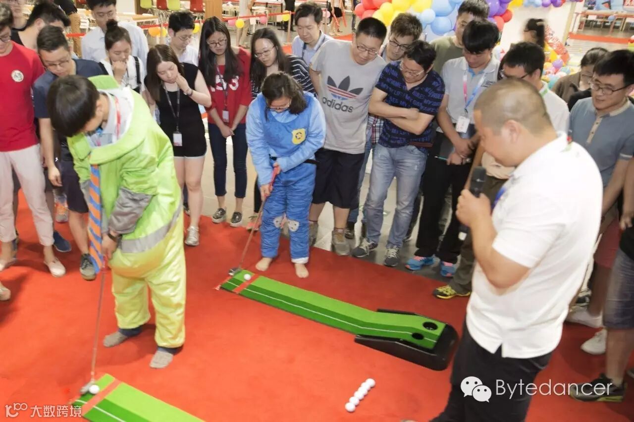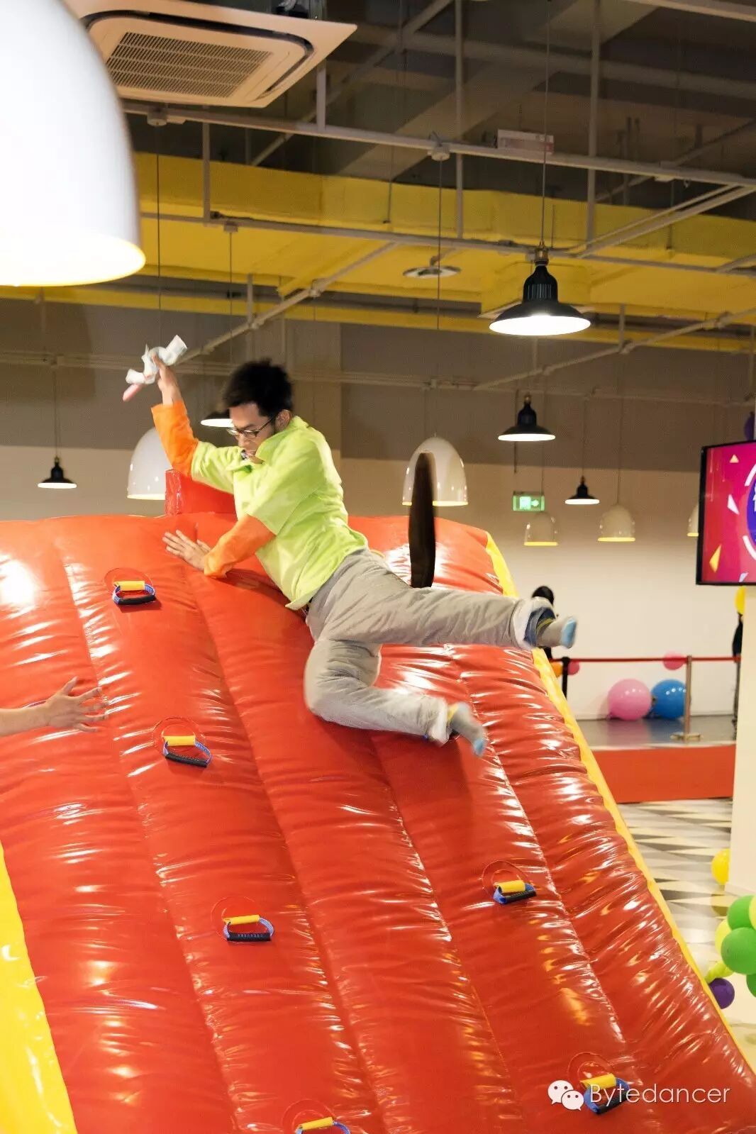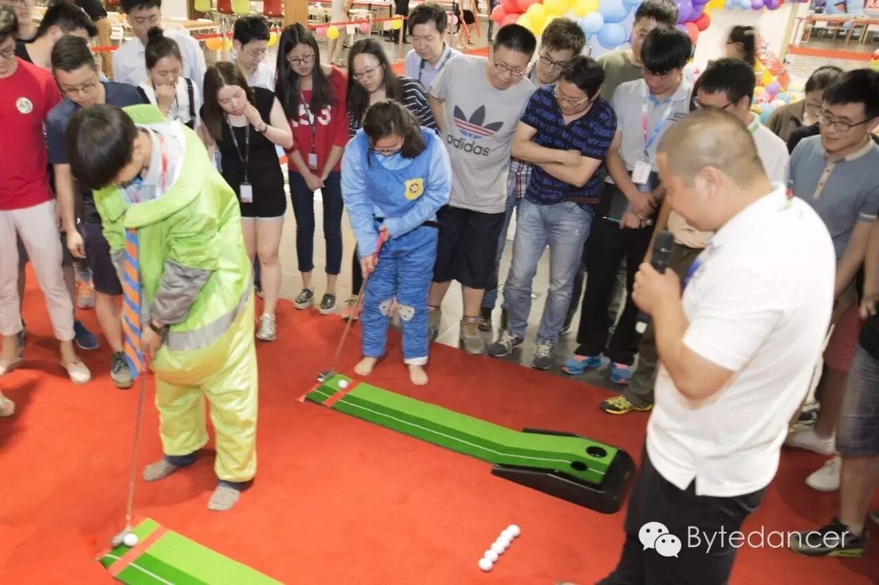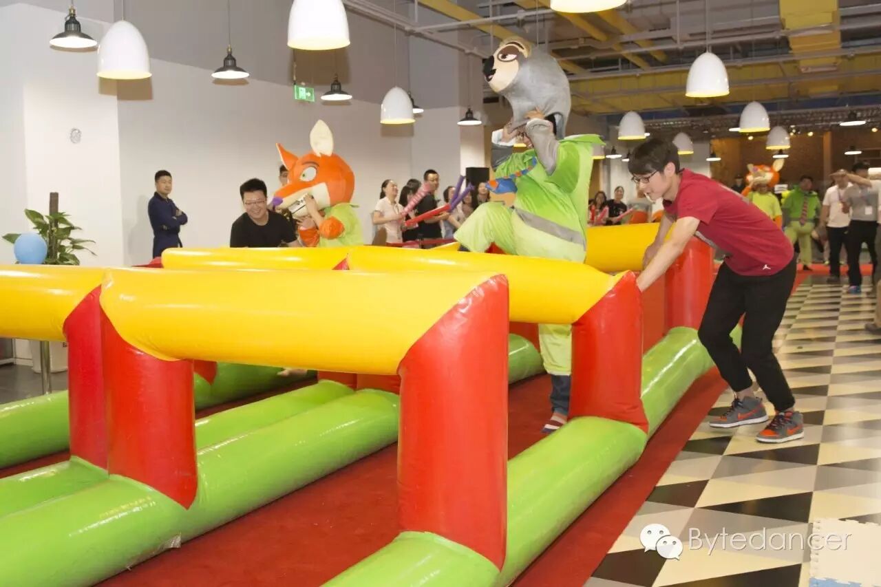 54名bytedancer们被分成9支队伍,他们需要身着公仔服装,快速通过4段不同的赛道——障碍跨栏、羊角球弹跳、指压板踩气球、迷你高尔夫——最后登顶拔旗。