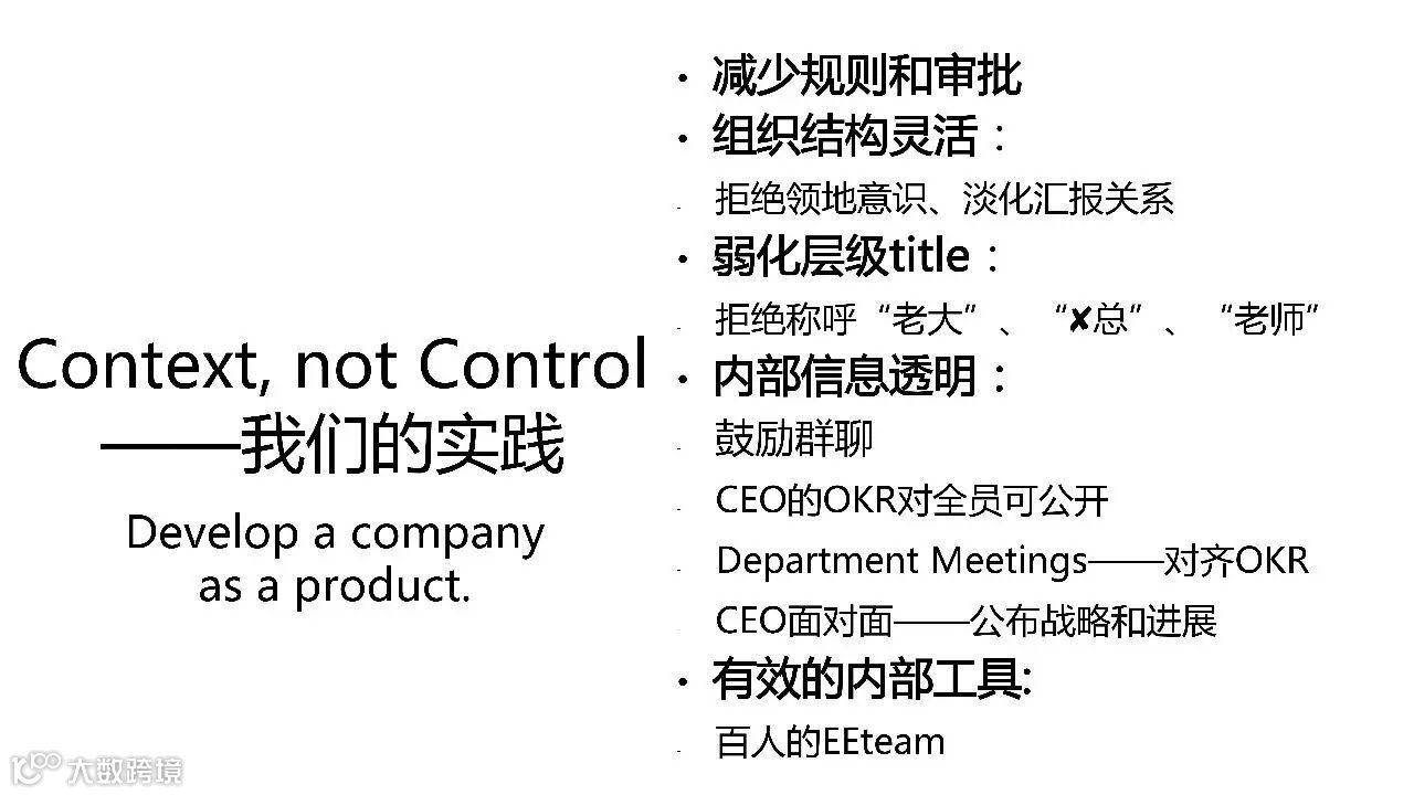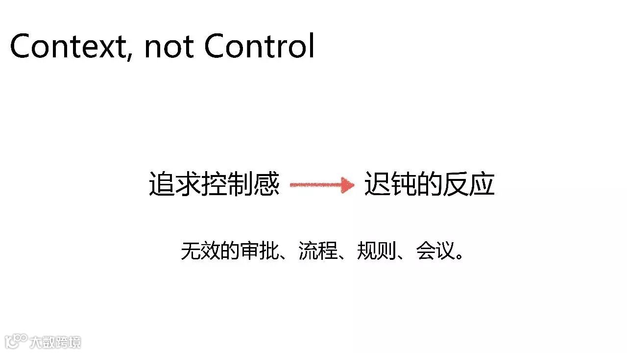 一鸣认为,“Context,not Control”是一种比较好的管理解决方案。Context指决策所需要的信息集合,Control则是追求控制感的各种流程。