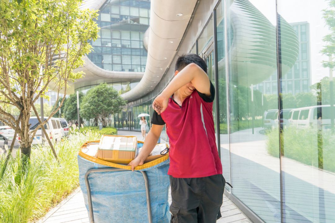 烈日照耀下的上海HQ天会(原凌空SOHO)仿佛四列蓄势待发的高铁。圆通上海福泉分公司业务员葛旗就像一个影子,悄无声息的送来朋友的礼物、亲人的思念、爱人的关怀……分拣后,葛旗一边擦汗一边拉着满载包裹的小推车开始今天的战斗。