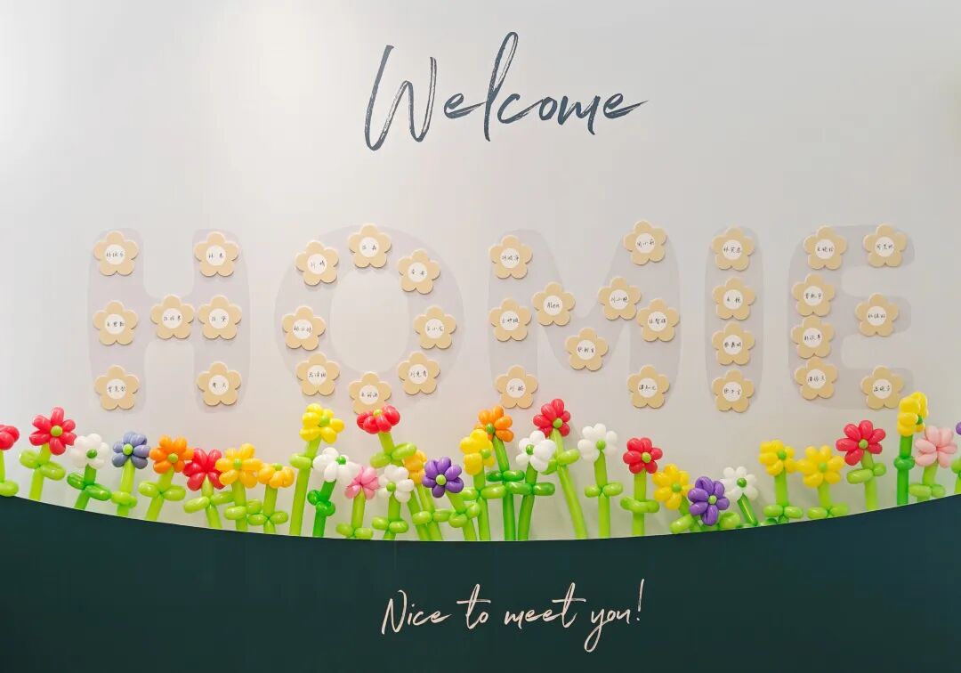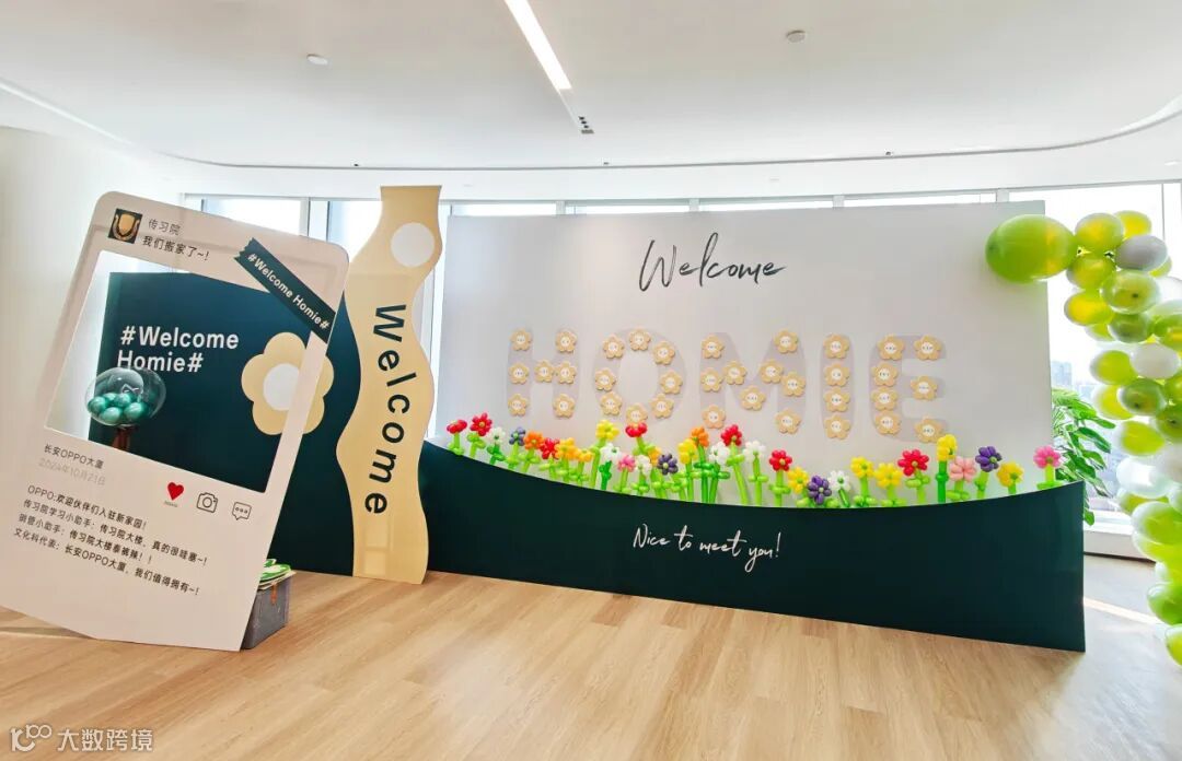 色彩斑斓的装饰中透露出满满的欢乐与期待。精心布置的拍照点前,早已聚集了众多OPPO员工及受邀嘉宾,他们将写有自己姓名的花朵贴在打卡墙上,组成了一个大大的“HOMIE”。