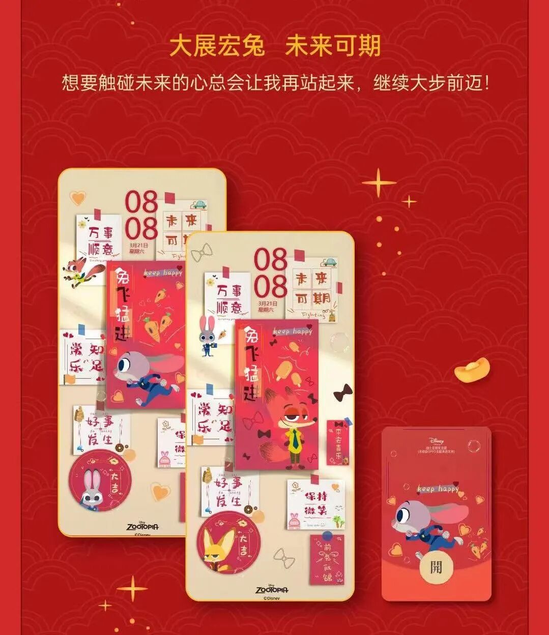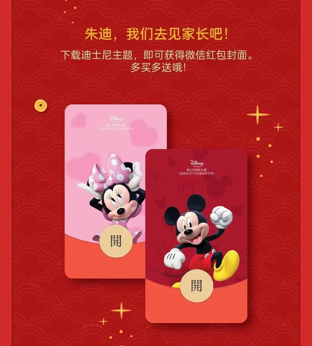 OPPO主题商店&迪士尼定制主题红包封面,每款限量100份,点击下方图中的红包封面“开”,即可免费领取,数量有限,先到先得,祝大家新年快乐!