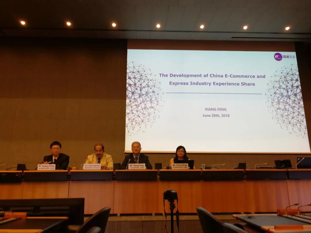 6月28日,世界贸易组织“电子商务发展与多边贸易体制研讨会”在瑞士日内瓦举行,各国驻世贸组织大使和代表共70余人参会,会议宗旨是介绍电子商务促进发展的“中国经验”。中国常驻世贸组织代表团张向晨大使出席会议并发言。来自圆通速递、阿里巴巴和华为等中国企业的专家就中国涉及电子商务的相关行业发展经验做了深入介绍。相峰应邀参加研讨会并就中国快递业的发展作了相关介绍。可以说,这是中国快递企业首次应邀出席WTO相关研讨会,也是中国快递企业首次在日内瓦站在国际舞台上展现中国快递企业形象,讲好中国快递故事。