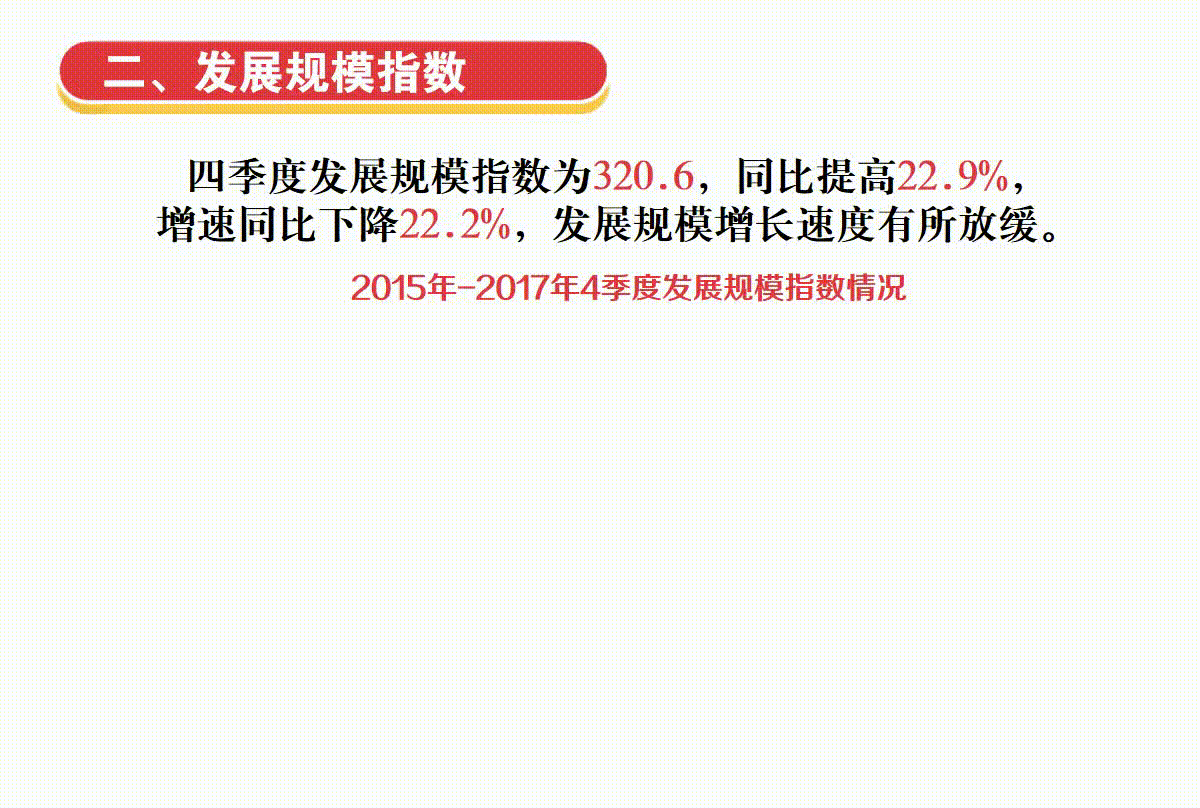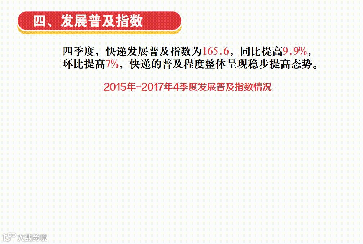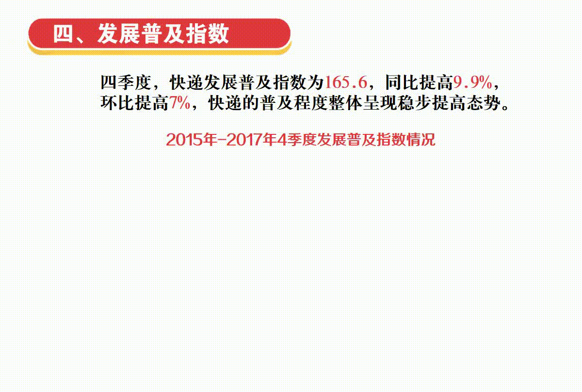2017年四季度,中国快递发展指数为208.5,同比提高16.8%,快递业仍处于稳步成长期,呈现出发展态势高位运行,市场结构持续优化,资源要素加速集聚,网络稳步向下延伸,服务能力显著增强的特点,较好地应对了旺季快递服务需求,快递准公共服务属性凸显。据国家邮政局发展研究中心市场监管研究处负责人耿艳介绍,2018年中国快递发展指数将调整优化指标体系,加大发布频次,月度快递发展指数将于2月初首次与公众见面。