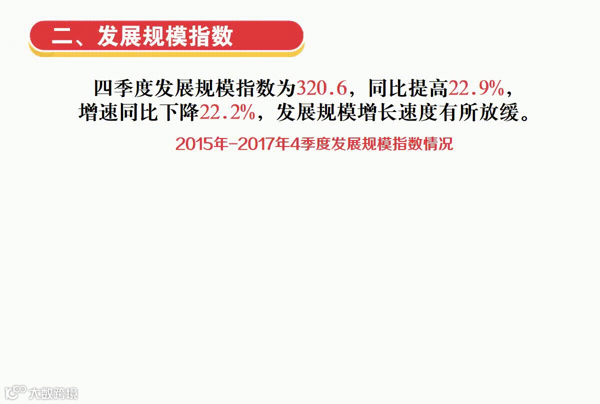从四个一级指标来看,2017年四季度发展规模指数为320.6,同比提高22.9%。四季度,网络购物所产生的快递量占快递业务总量的近七成,比三季度提高近10个百分点;全国快递业务量约完成126.6亿件,同比增长24.3%,占全年的比重达31.6%,为全年最高;日均快件处理量接近1.4亿件,“双11”期间最高日处理量3.3亿件,同比增长31.5%。