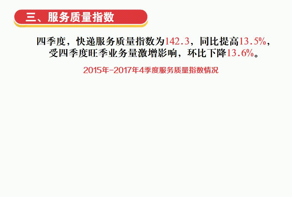 四季度快递服务质量指数为142.3,同比提高13.5%,受旺季业务量激增影响,环比下降13.6%,总体而言经受住了旺季考验。
