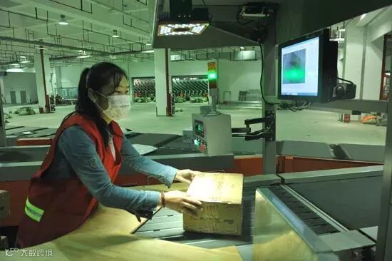 在供包台处,小编看到一名女操作员正在一台电子屏幕前将条码朝上放置快件。“它配置了高像素的相机识别系统,可以快速准确读取面单条码信息。” 女操作员话声刚落,“嗦”的一声,一票快件就自动输送到小车托盘的中央,被传送带快速“带走”。