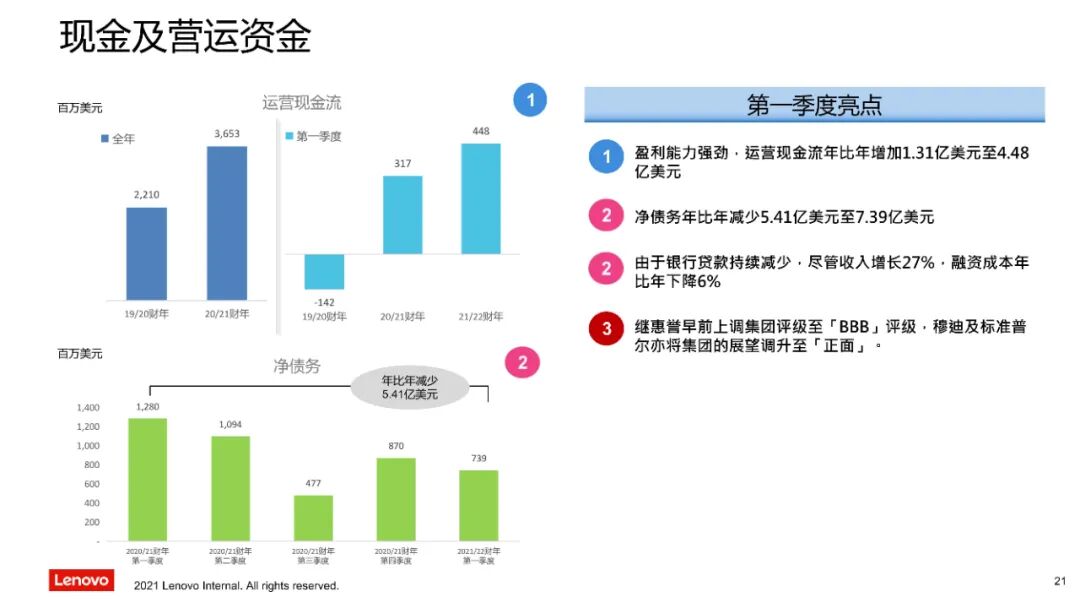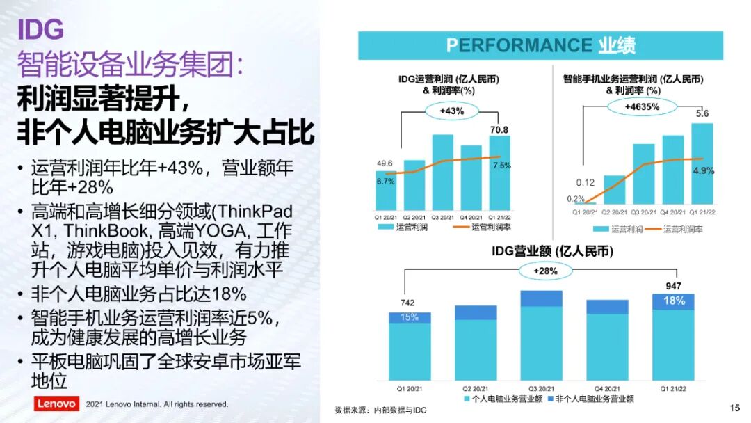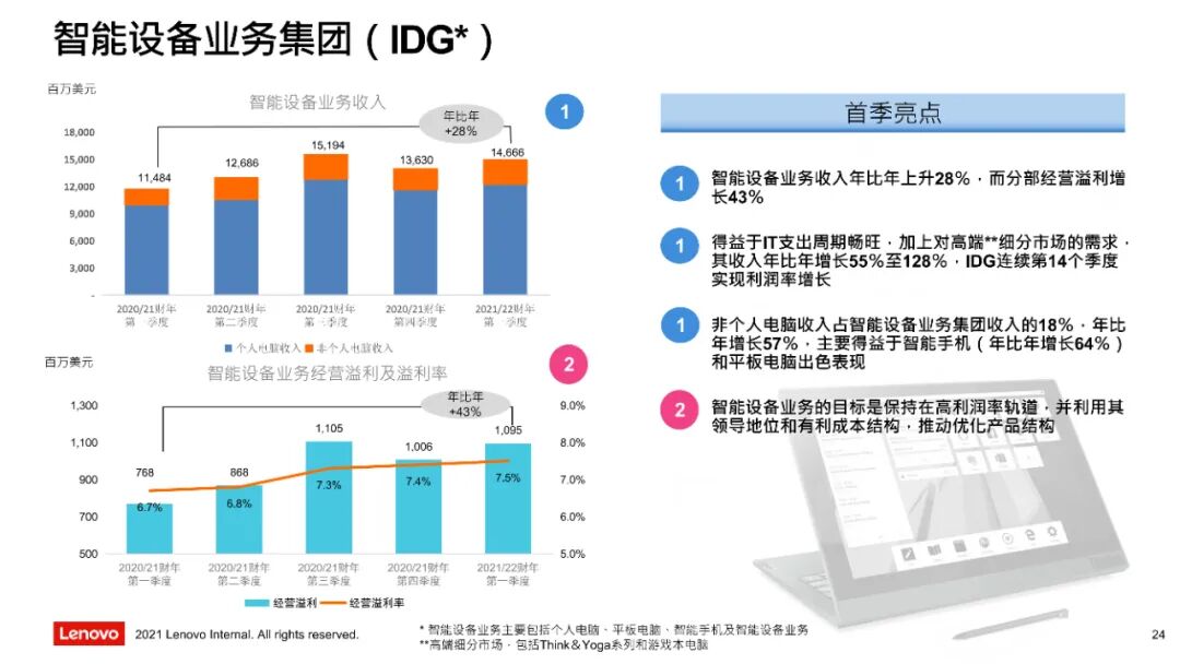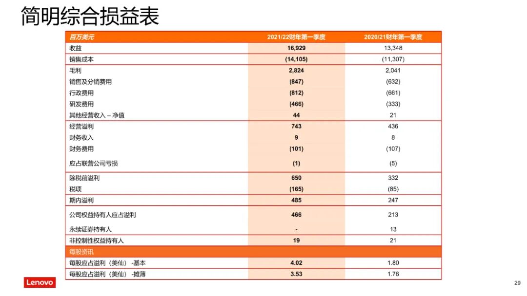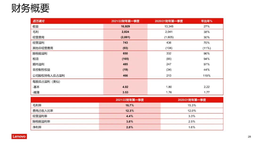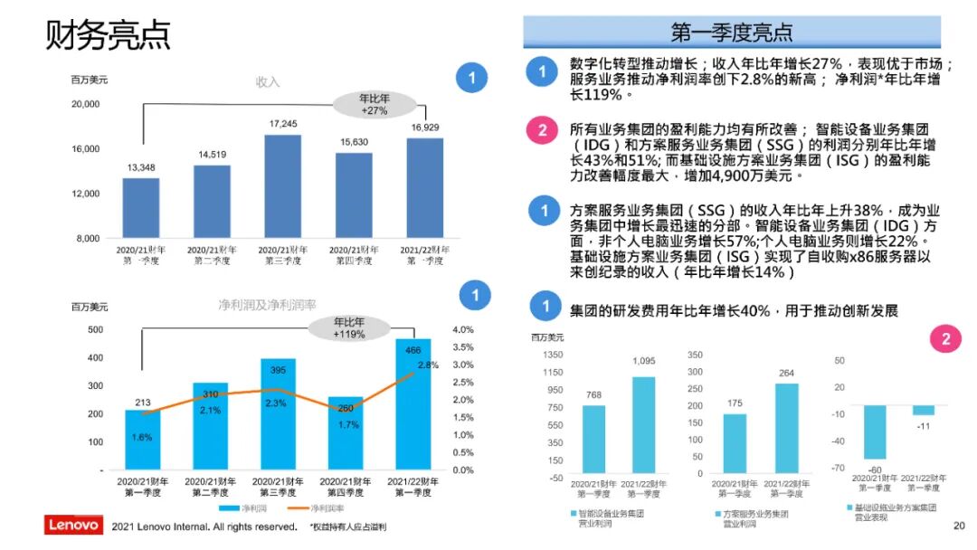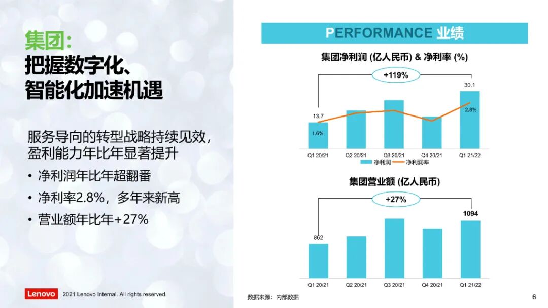 导读:联想集团公布创历史新高的第一季度业绩,营业额继续高速增长,达到169亿美元,年比年增长27%,净利润年比年增长119%。