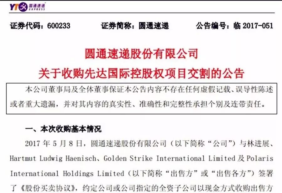 2017 年 5 月 8 日,圆通速递股份有限公司(以下简称“公司”)与林进展、Hartmut Ludwig Haenisch、Golden Strike International Limited 及 PolarisInternational Holdings Limited签署了《股份买卖协议》,约定公司或公司指定的全资子公司以现金方式收购出售方合计持有的先达国际物流控股有限公司(以下简称“先达国际”)255,820,000股股份,占先达国际全部已发行股份 61.8724%,目标股份对价为 1,041,116,160元港币(折合每股 4.0698 元港币)。