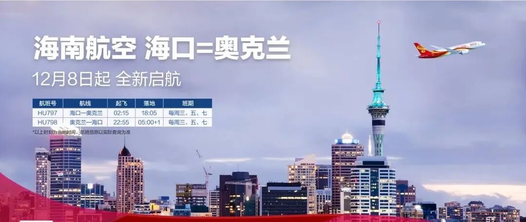 海南航空计划于12月8日起新开海口—奥克兰国际航线,这是海南航空近期在海口又一重要航线布局,也是海口首条直飞新西兰的国际航线。该航线作为海南省开通的首条通往新西兰航线,将对海口、奥克兰两地的经济发展、人文交流起到积极的促进作用。这是海南航空继海口—悉尼、海口—墨尔本、深圳—奥克兰航线后的第四条直飞大洋洲的航线,也是海南航空在海口出港的第八条国际及地区航线,搭建起海南通往大洋洲的便捷桥梁。
