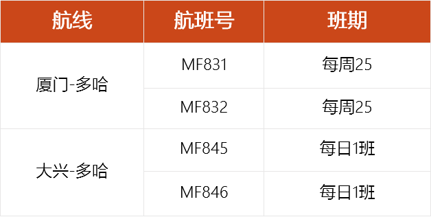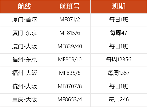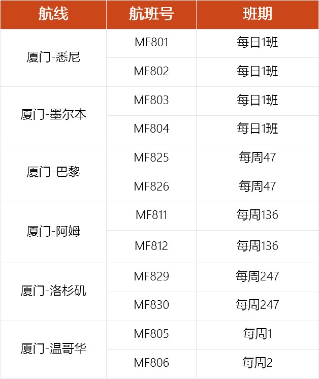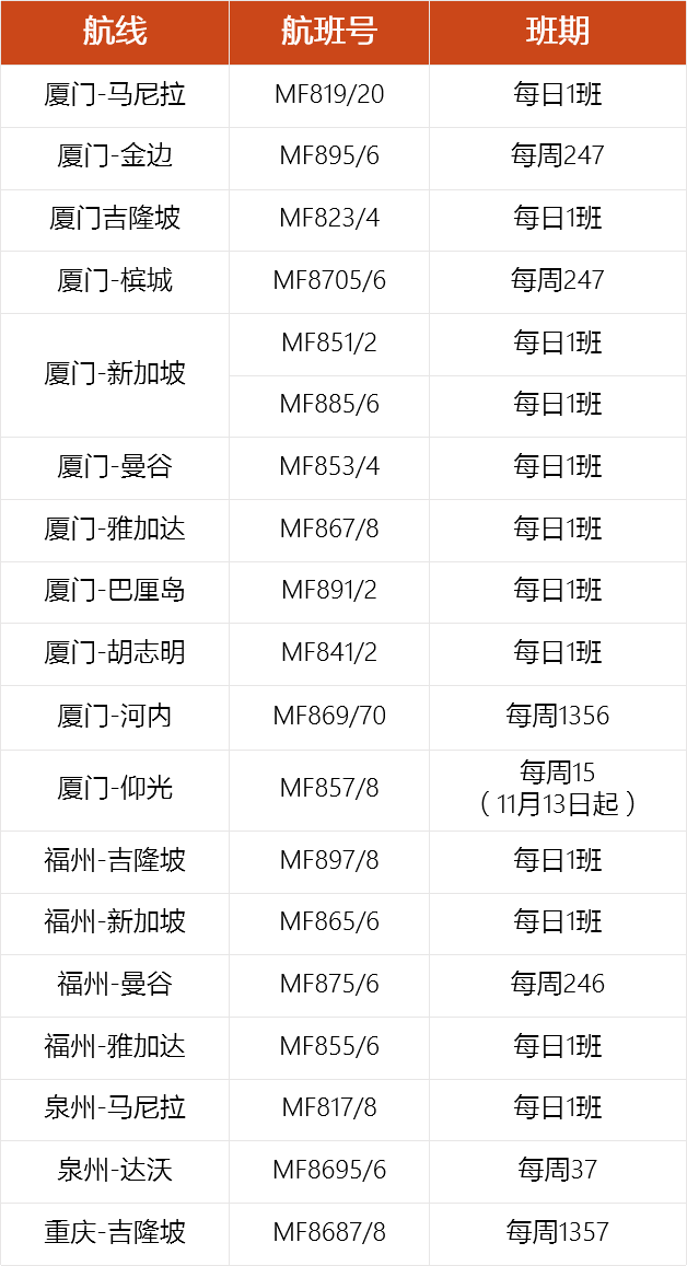厦航2023年11月国际及地区航班信息