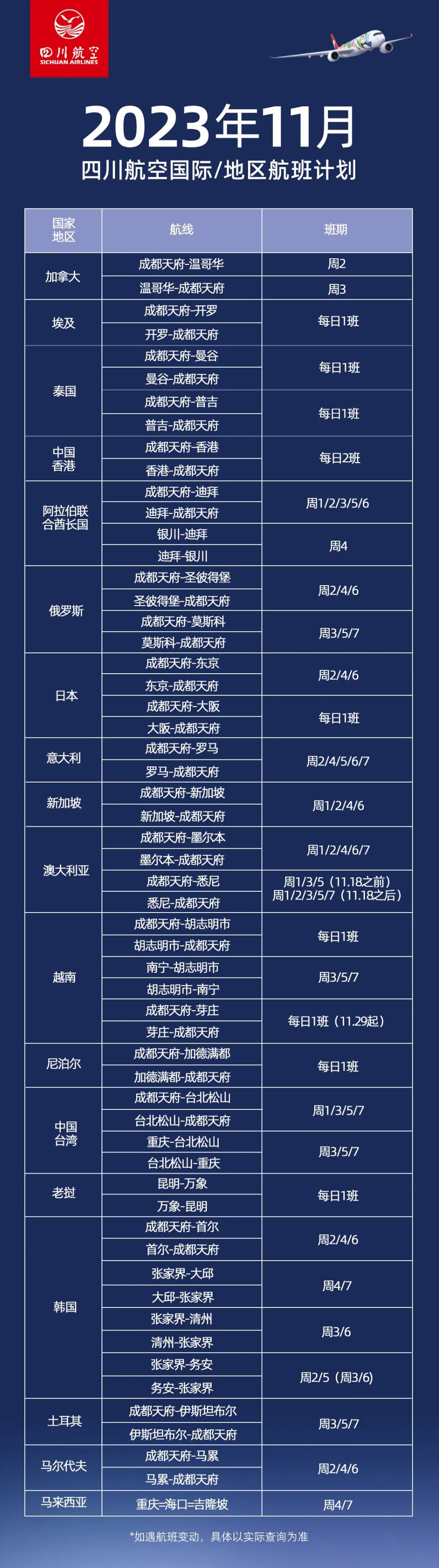 川航11月国际/地区航班计划出炉