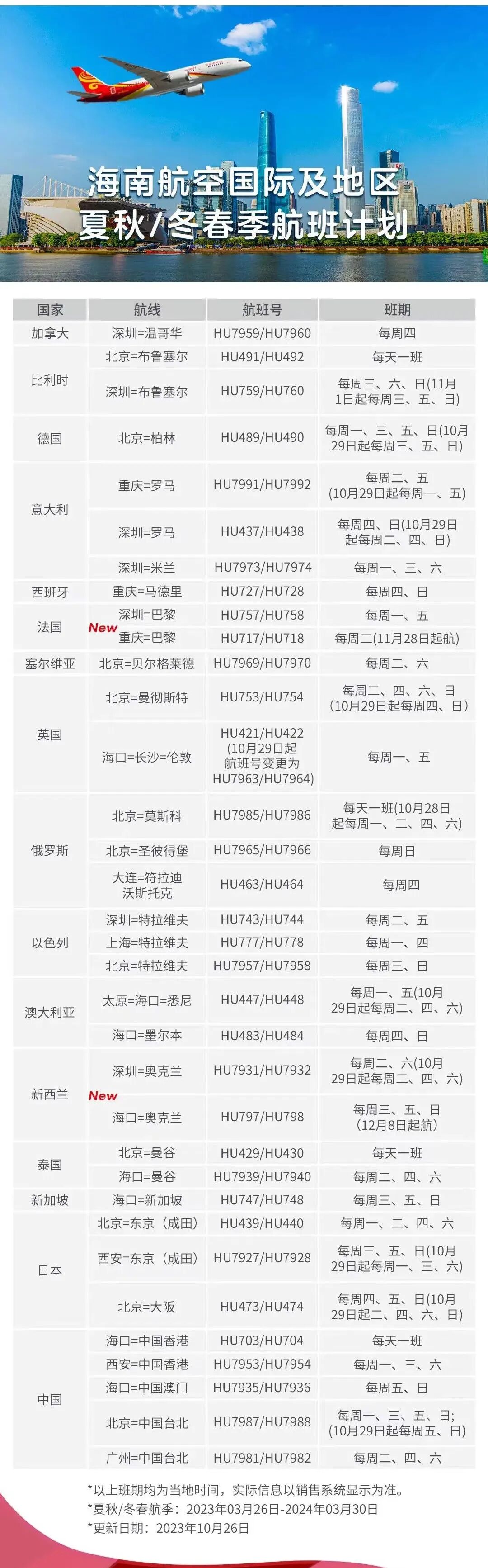海南航空冬春季航班计划