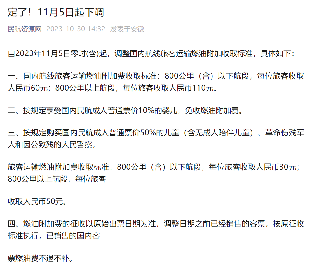 据民航资源网信息,自2023年11月5日零时(含)起,调整国内航线旅客运输燃油附加收取标准,国内航线旅客运输燃油附加费收取标准:800公里(含)以下航段,每位旅客收取人民币60元;800公里以上航段,每位旅客收取人民币110元。此次相较于调整前分别降低了10元和20元,具体如下: