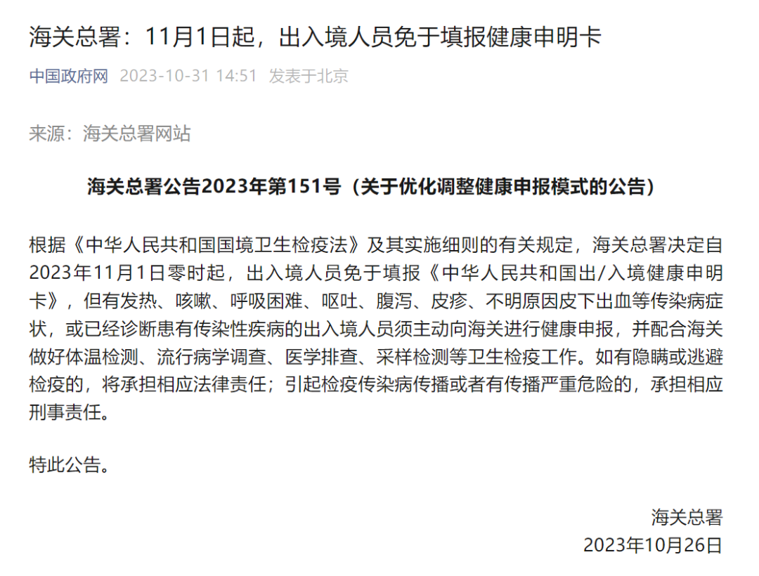 根据海关总署公告,自2023年11月1日零时起,出入境人员免于填报《中华人民共和国出/入境健康申明卡》。