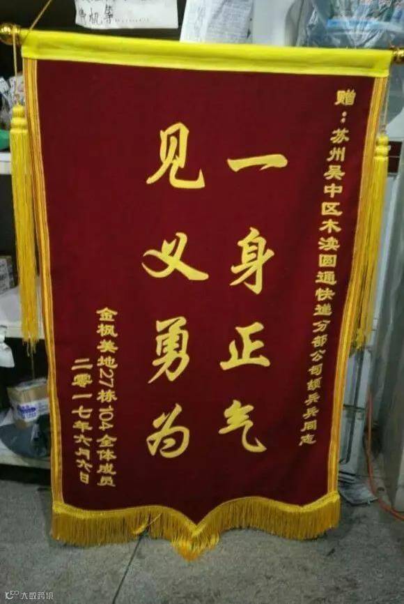 2017年6月6日傍晚,家住木渎金枫美地区的陈女士下班后来到圆通木渎加盟网点,特地向业务员颉兵兵送上锦旗,聊表谢意。