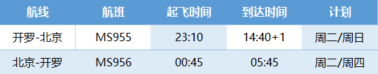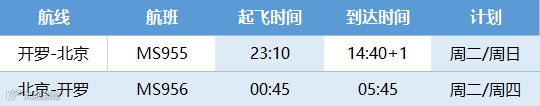 从3月7日起(含),埃及航空开罗至北京的往返航班MS955/MS956恢复正常运营。请参考以下航班时刻: