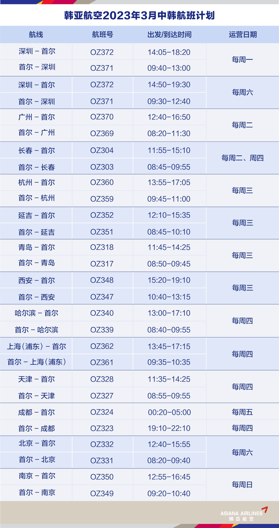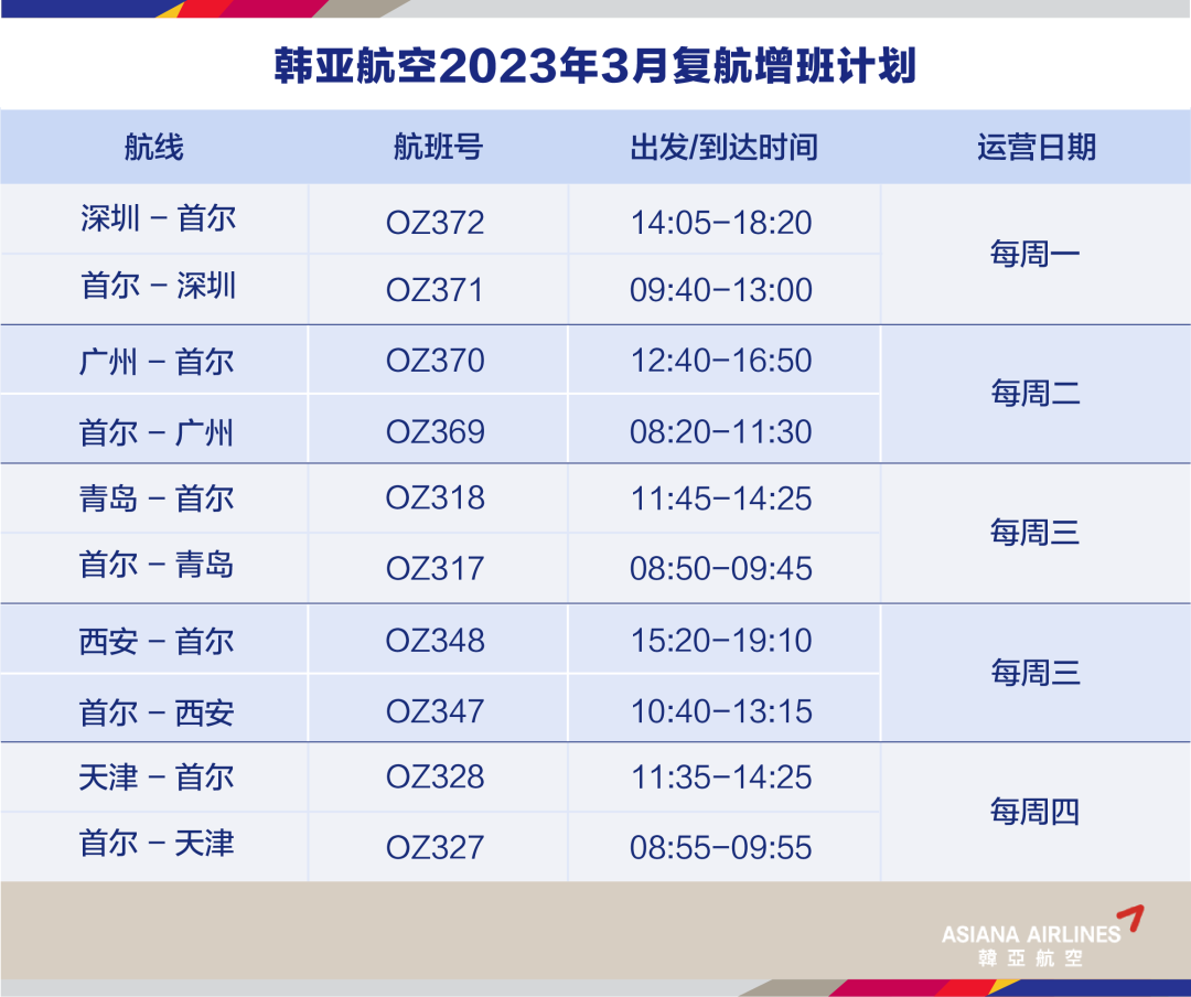复航通知 | 韩亚航空3月中韩航班计划更新