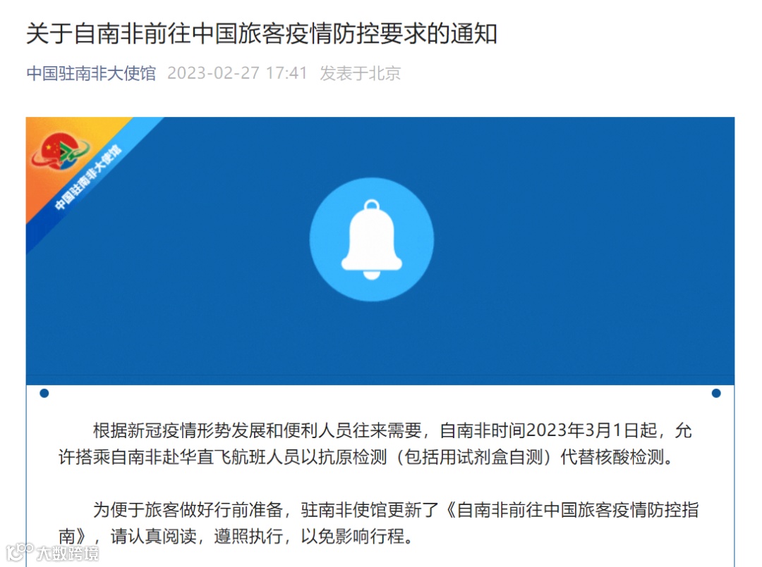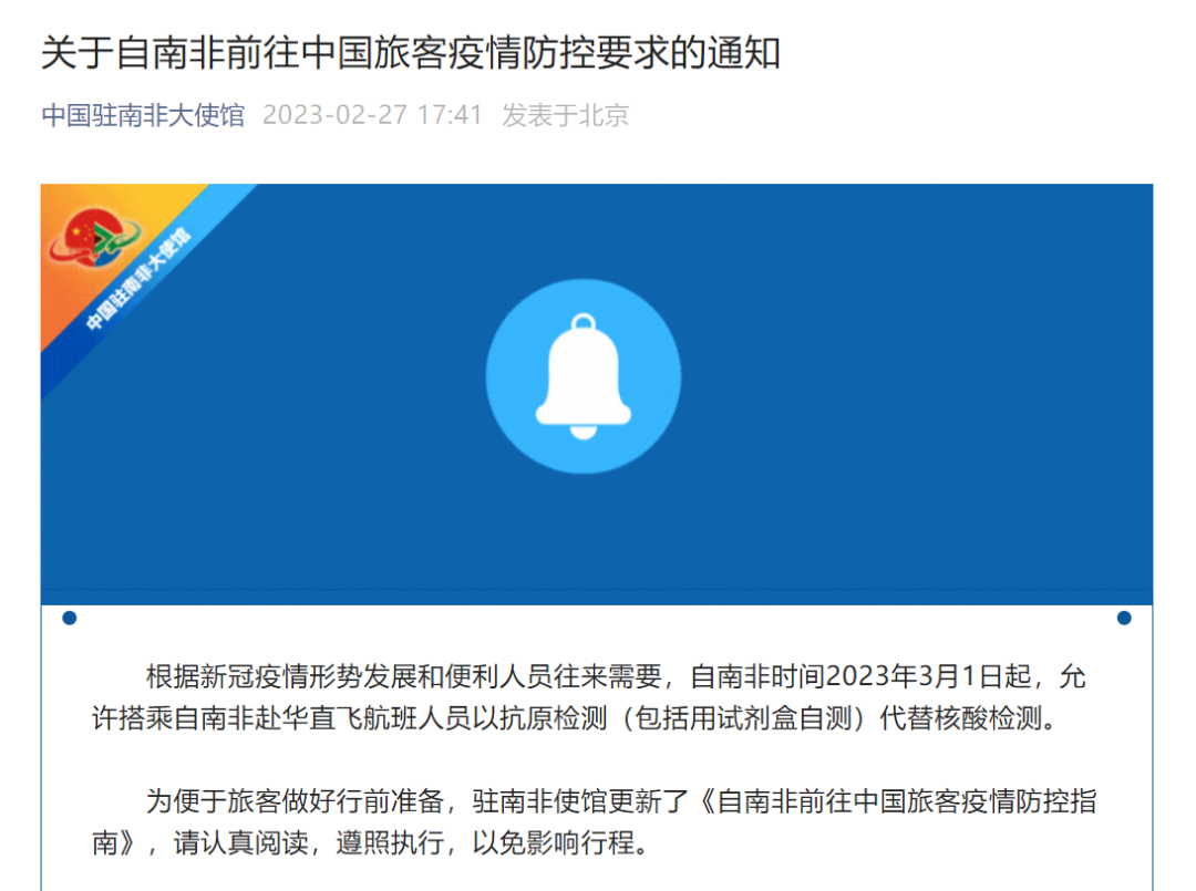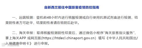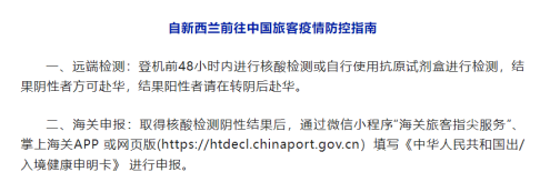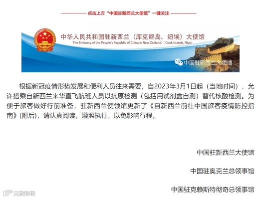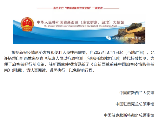 根据中国驻新西兰大使馆的最新通知,自3月1日起,新西兰直飞来华航班旅客以抗原代替核酸检测,结果阴性方可赴华,航空公司不再需要在登机前查验结果。