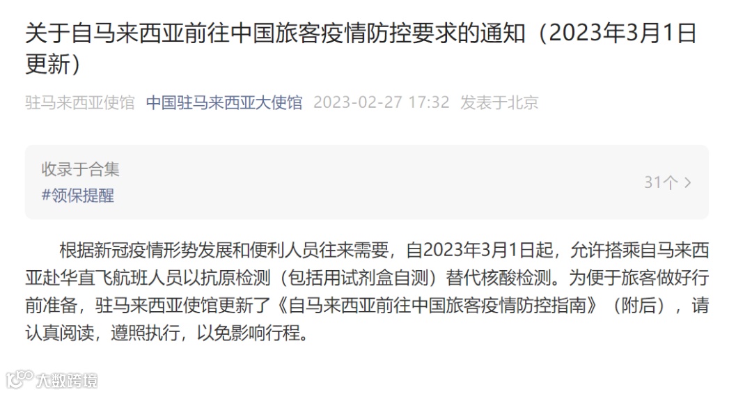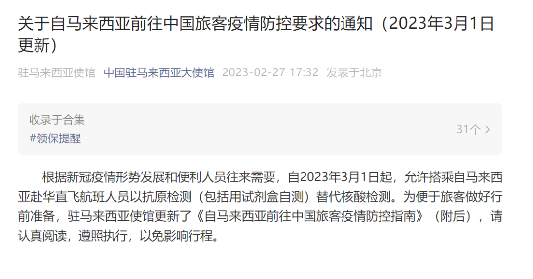 · 3月起新西兰、泰国、马来西亚等国赴华允许抗原检测代替核酸检测