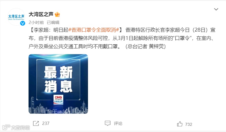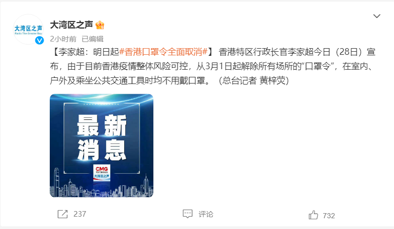 香港特区行政长官李家超今日(2月28日)宣布,由于目前香港疫情整体风险可控,从3月1日起解除所有场所的“口罩令”,在室内、户外及乘坐公共交通工具时均不用戴口罩。
