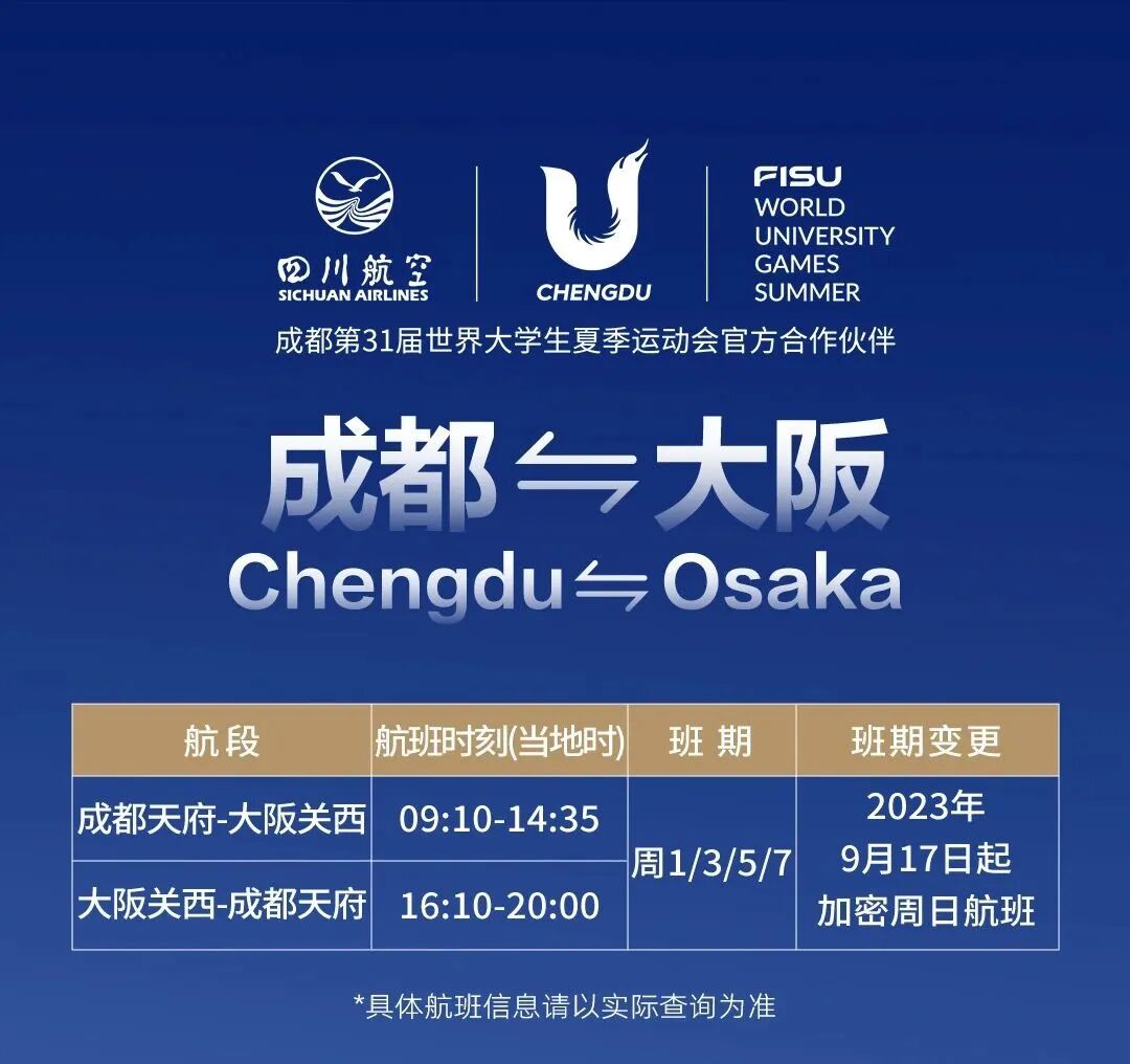 9月17日起,成都天府=大阪航线增班,每周1/3/5/7四班执飞!