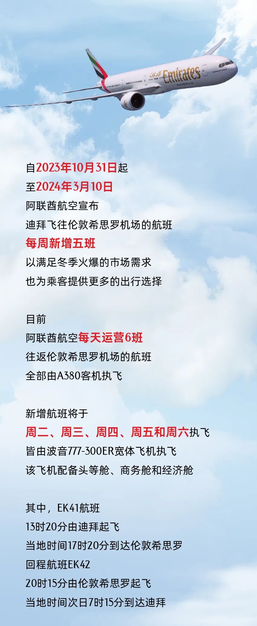 ■ 阿联酋航空:迪拜=伦敦秋冬季航线增班