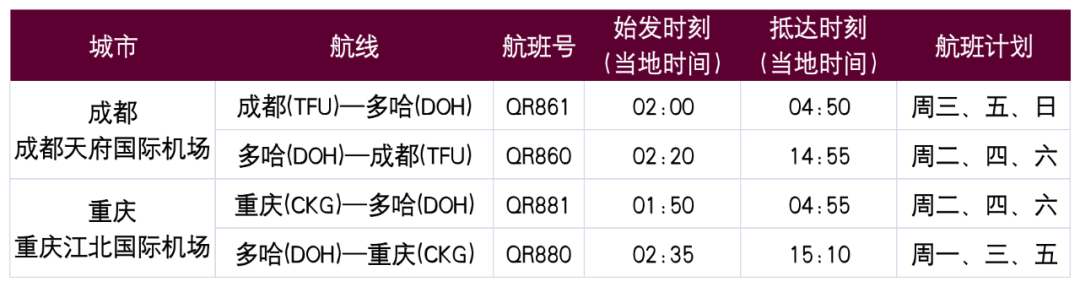 卡塔尔航空将于2023年9月24日正式恢复成都(TFU)往返多哈的航班,于2023年9月26日正式恢复重庆(CKG)往返多哈的航班。
