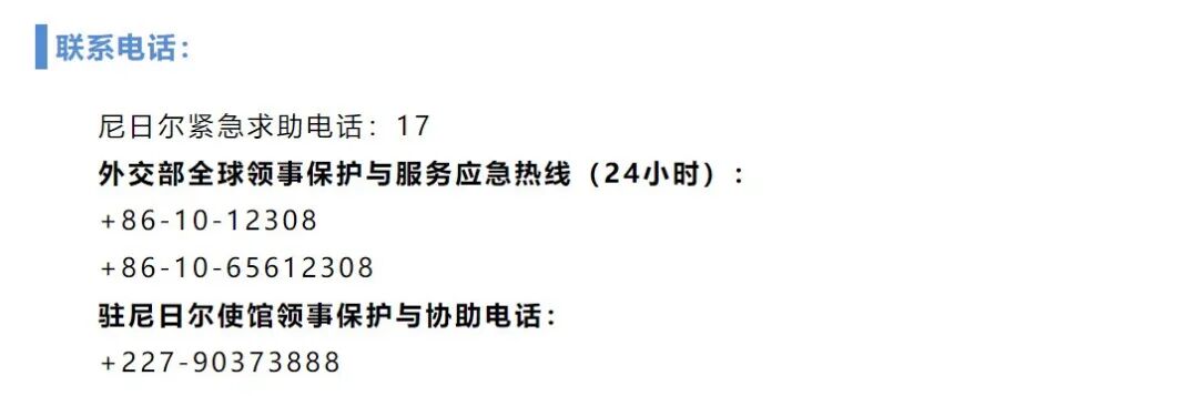 驻尼日尔使馆提醒在尼中国公民近期暂勿前往蒂拉贝里、阿加德兹及迪法大区。已在相关地区人员和机构密切关注安全形势,保持高度警惕,加强安全防范和应急准备,减少非必要外出,确保人身和财产安全。如遇紧急情况,请及时报警并与驻尼日尔使馆联系寻求协助。