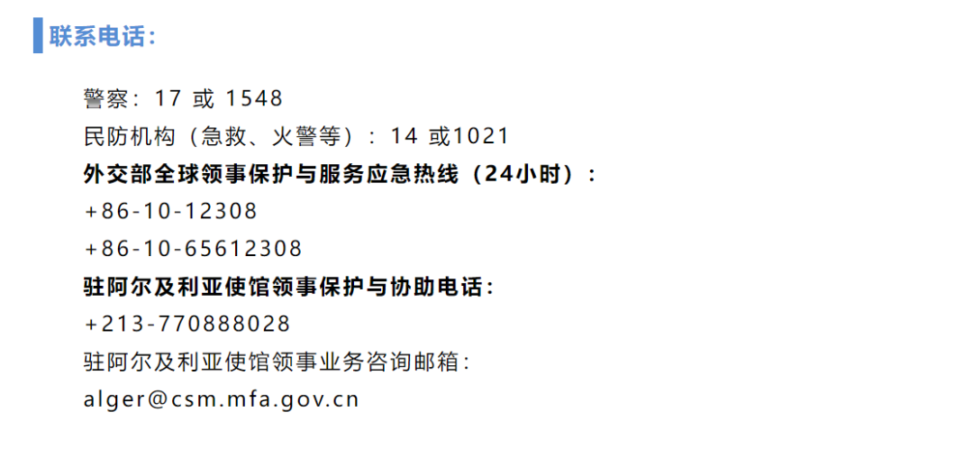 驻阿尔及利亚使馆提醒在阿中国公民和机构提高警惕,做好安全防护。如遇盗抢等暴力事件,请优先保障自身安全,在确保安全的情况下第一时间报警,并拨打使馆领事保护与协助电话寻求协助。