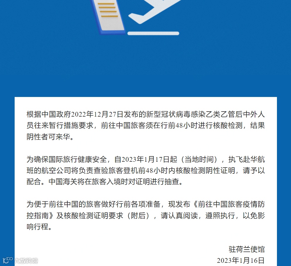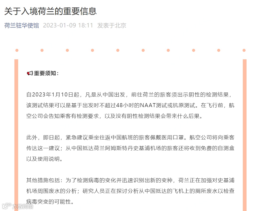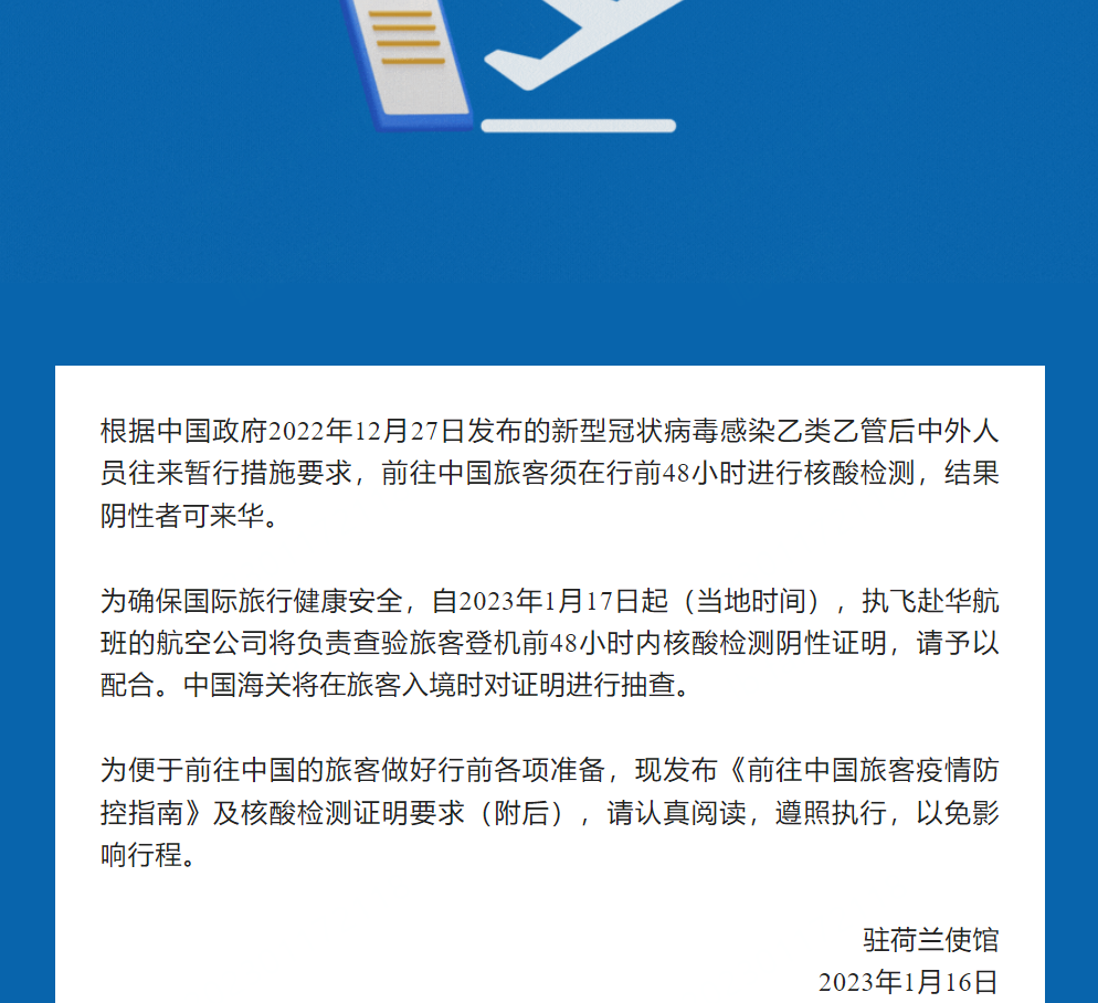 1月9日,荷兰驻华大使馆发布“关于入境荷兰的重要信息”: