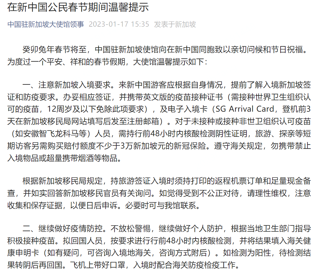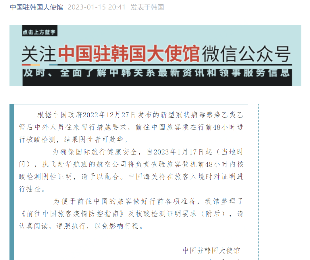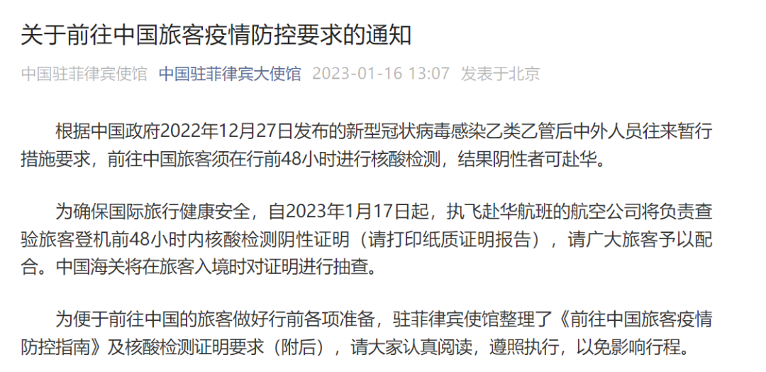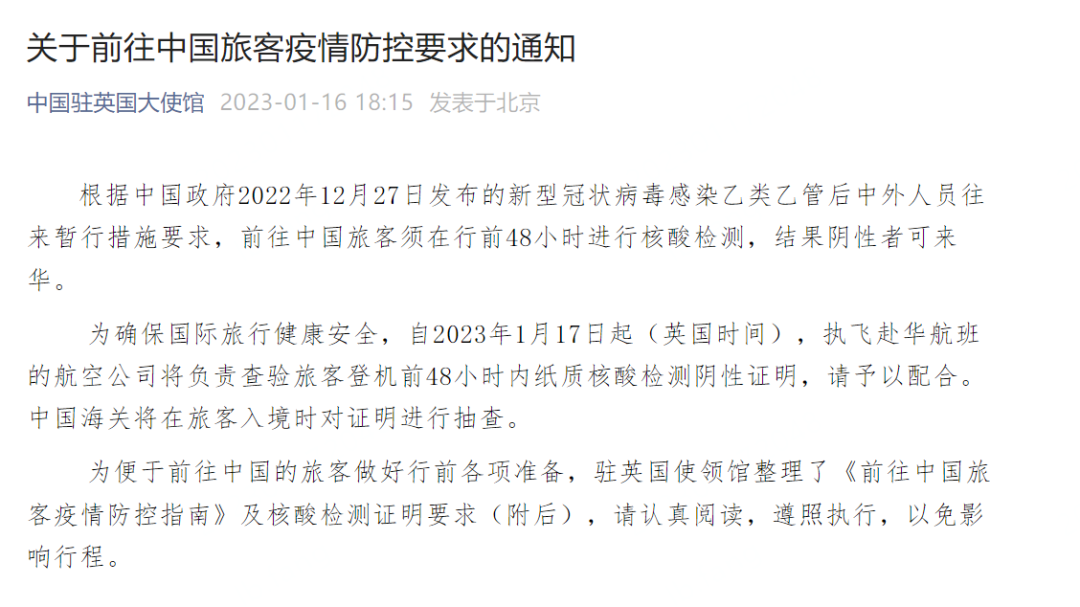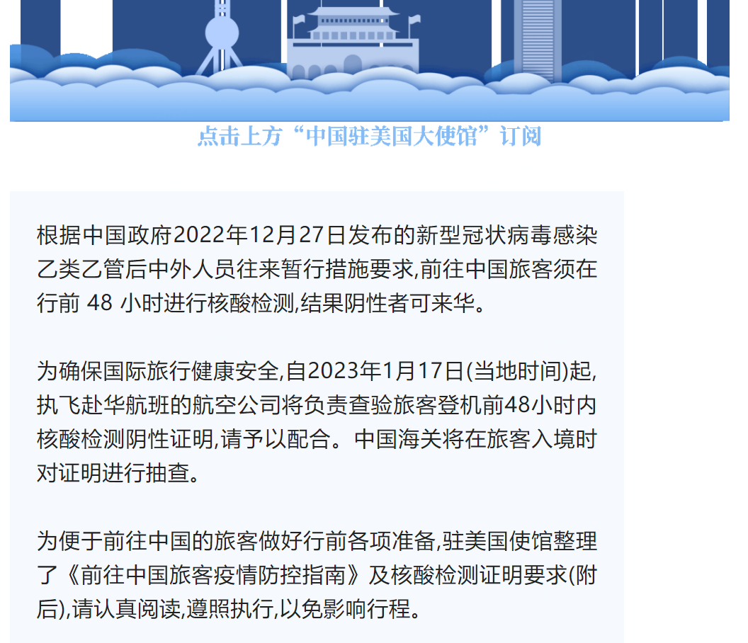 为确保国际旅行健康安全,自2023年1月17日起(当地时间),执飞赴华航班的航空公司将负责查验旅客登机前48小时内核酸检测阴性证明,请予以配合。中国海关将在旅客入境时对证明进行抽查。